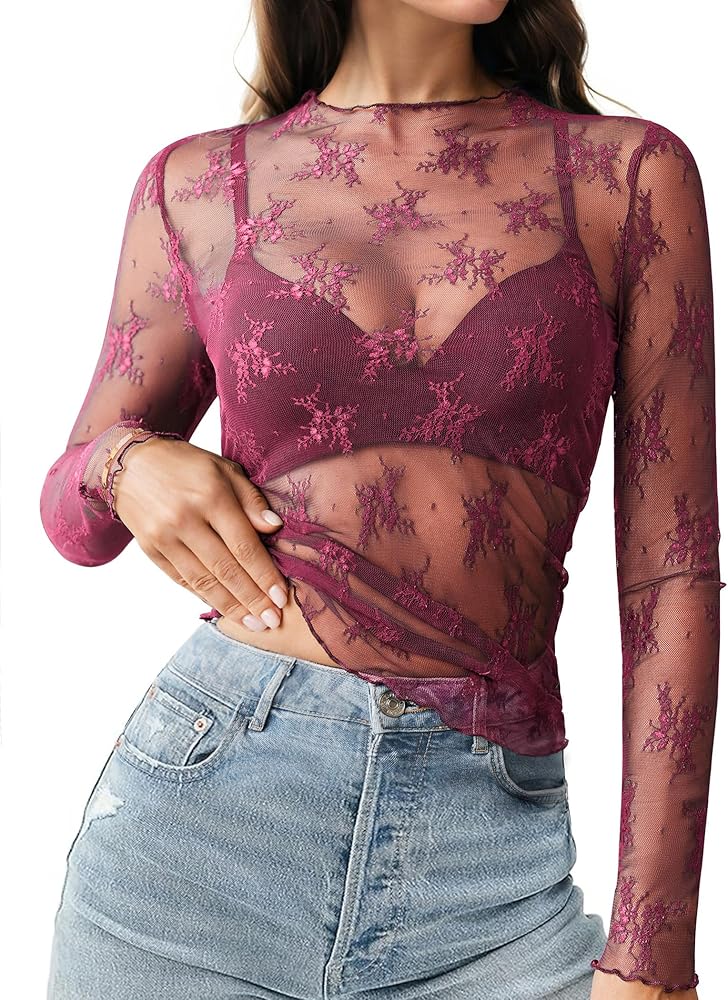 【Features】:This women's mesh long sleeve top features a sexy lace see-through design with floral embroidery to enhance your fashion taste. Perfect for layering, this women's see-through top is a versatile and chic piece for women, girls and ladies.