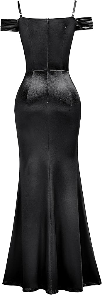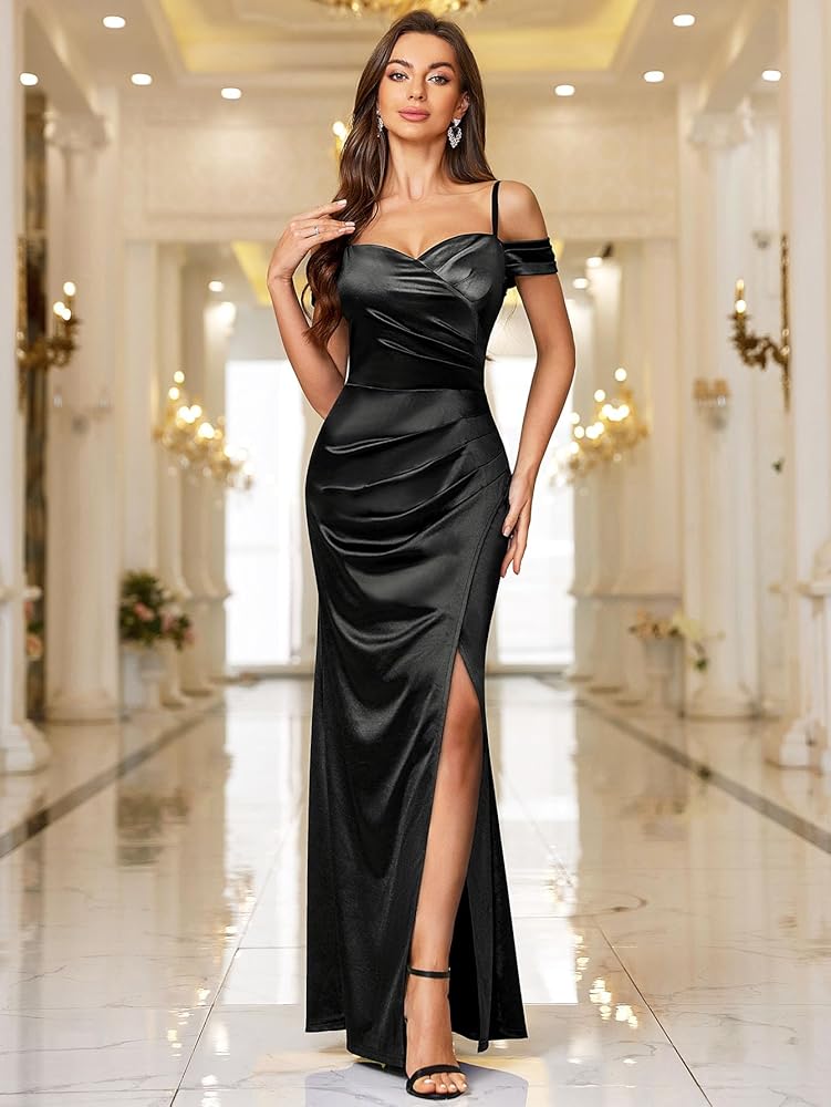 - Satin Fabric, Sexy Off-shoulder, Cold Shoulder Sleeve, Spaghetti strap, Zipper on the Back, Maxi Dress