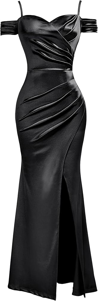 Miusol Women's Sexy Off Shoulder Satin High Split Ruched Style Evening Party Maxi Dress