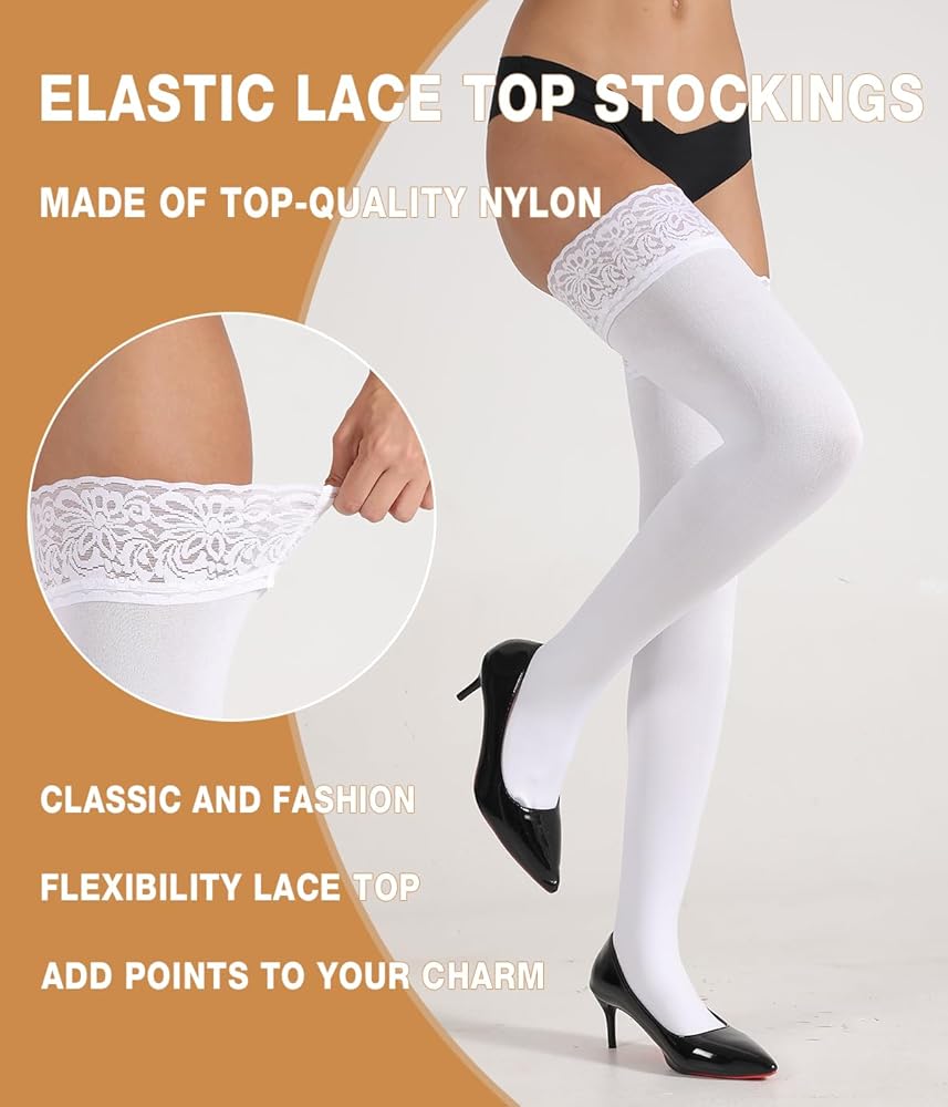 Double-Layer Anti-Slip Lace Top - Our thigh high stockings for women are made of top-quality and delicately crafted stretchy nylon, the double-layer reinforced silicone in the lace can stay up all day. Additionally, It can also cover some small flaws on the legs, outline the lines of the legs, and let you have slender and charming legs.