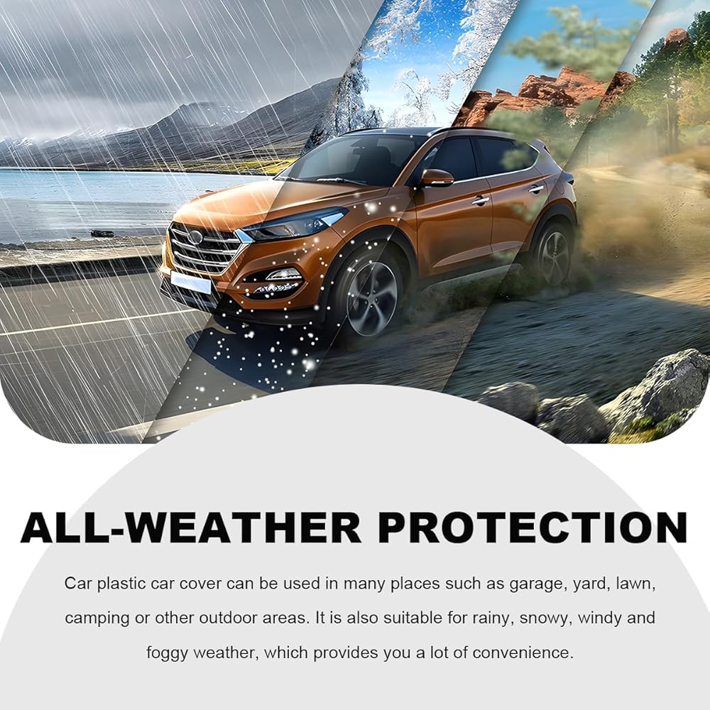 【Full Protection】: This plastic protector can cover your car in all directions, effectively protect all parts of your car from dust, sand, snow, rain, water, leaves, bird droppings or other external dirt. It blocks all kinds of dirt and keeps your car clean and tidy when parked outdoors.