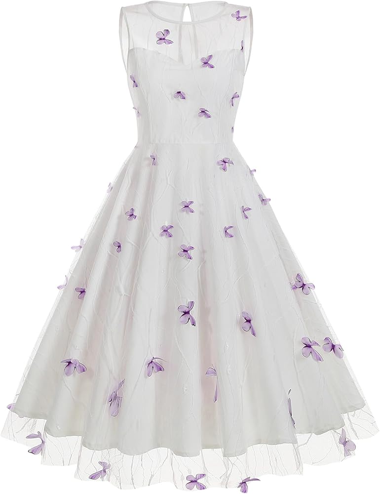 Women's 1950s Retro Vintage Dress Sleeveless Round Neck Mesh Butterfly or Heart Print Swing Dress Cocktail Dress