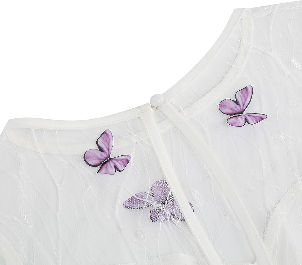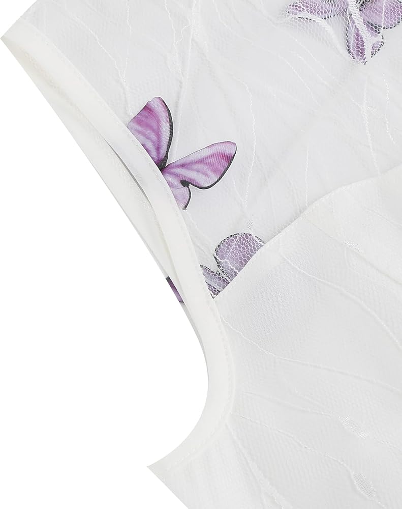 Features: Sleeveless, Illusion Round Neck, Collect Waist, Mesh, 3D Butterfly/ Heart Print, Hidden Back Zipper, Cutout, Button Closure, Swing Style
