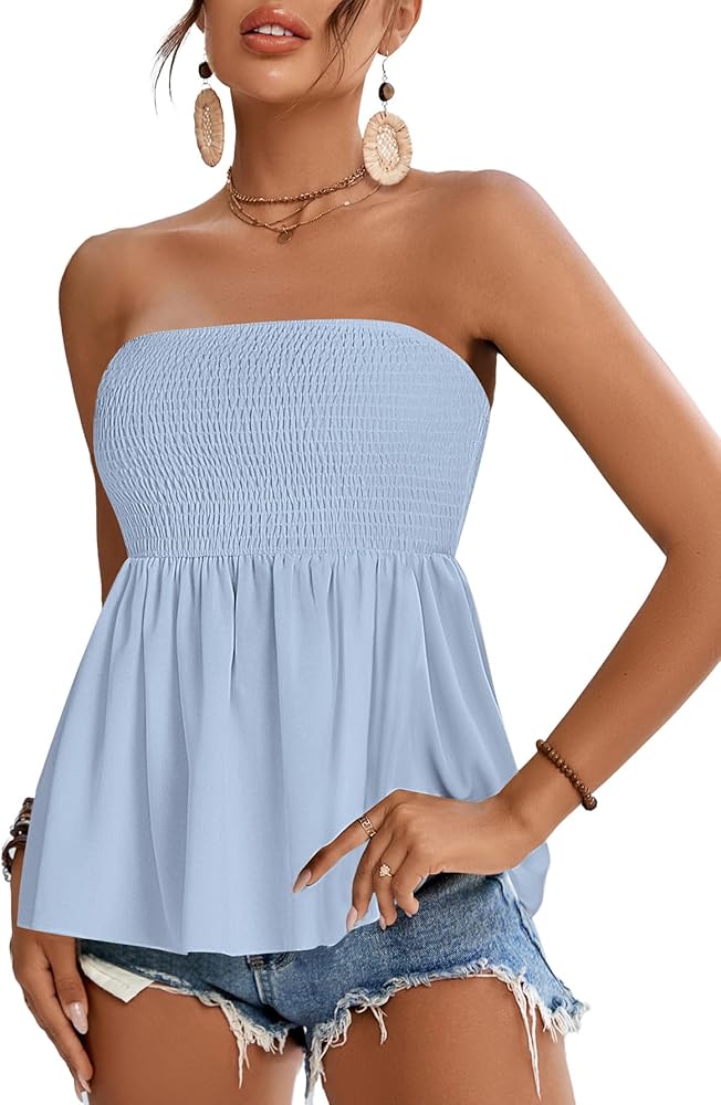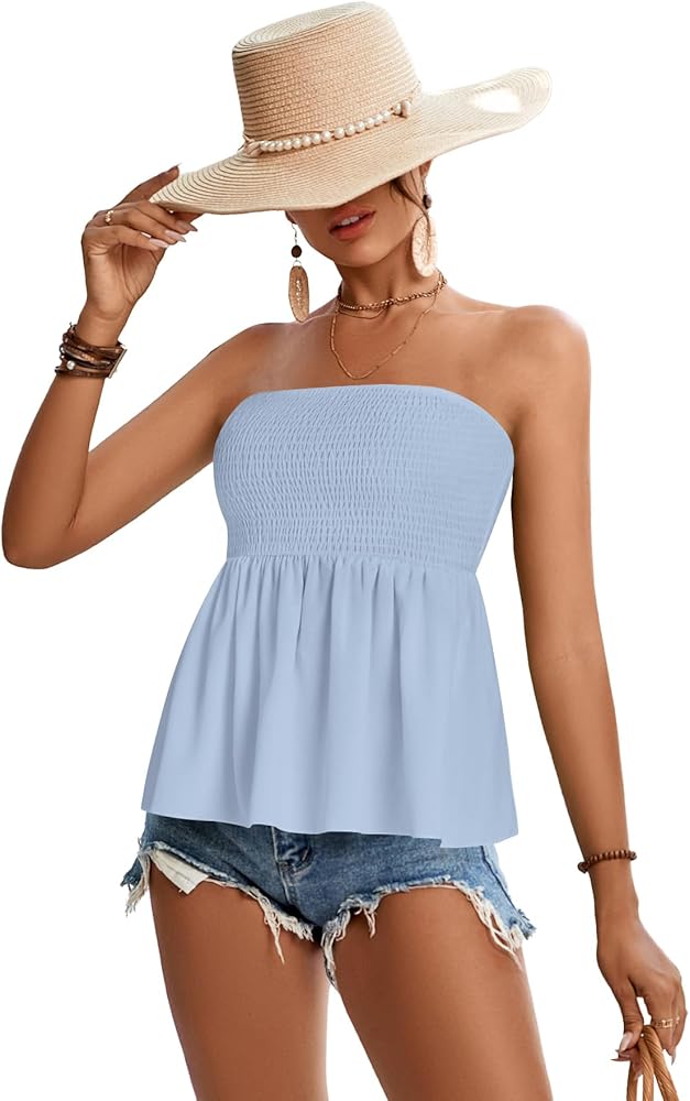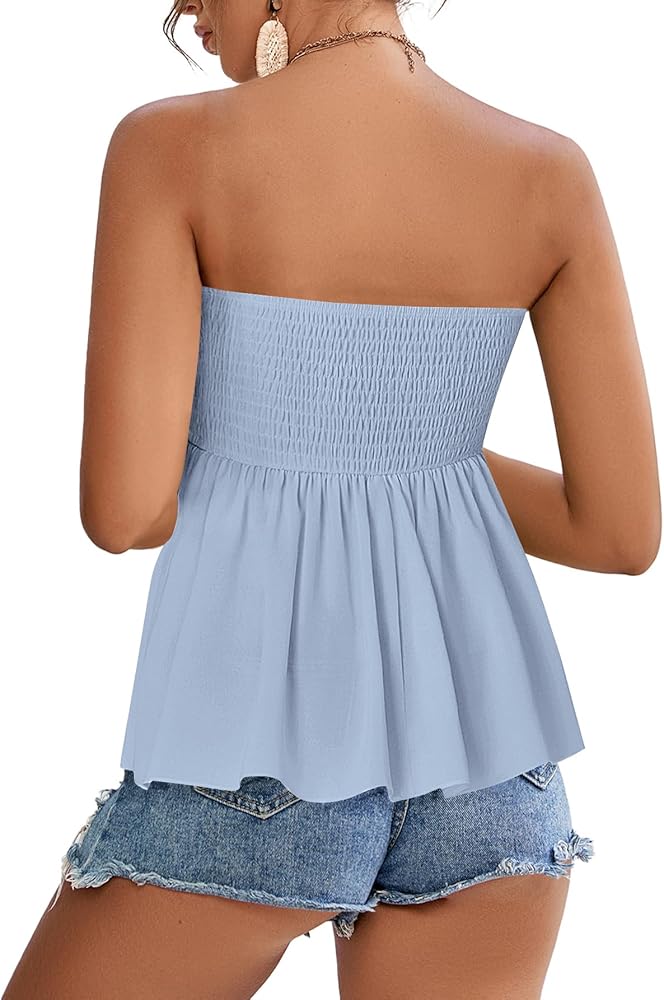 Sleeveless strappy tube top features with smocked/shirred at top, hugs your body perfectly, never fall down. Flowy peplum/babydoll ruffle hem a line design with pleated ruched at waist detailing, show off your charming curves but hide your belly fat.Backless and straless cami, let you feel cool even in the summer heat!