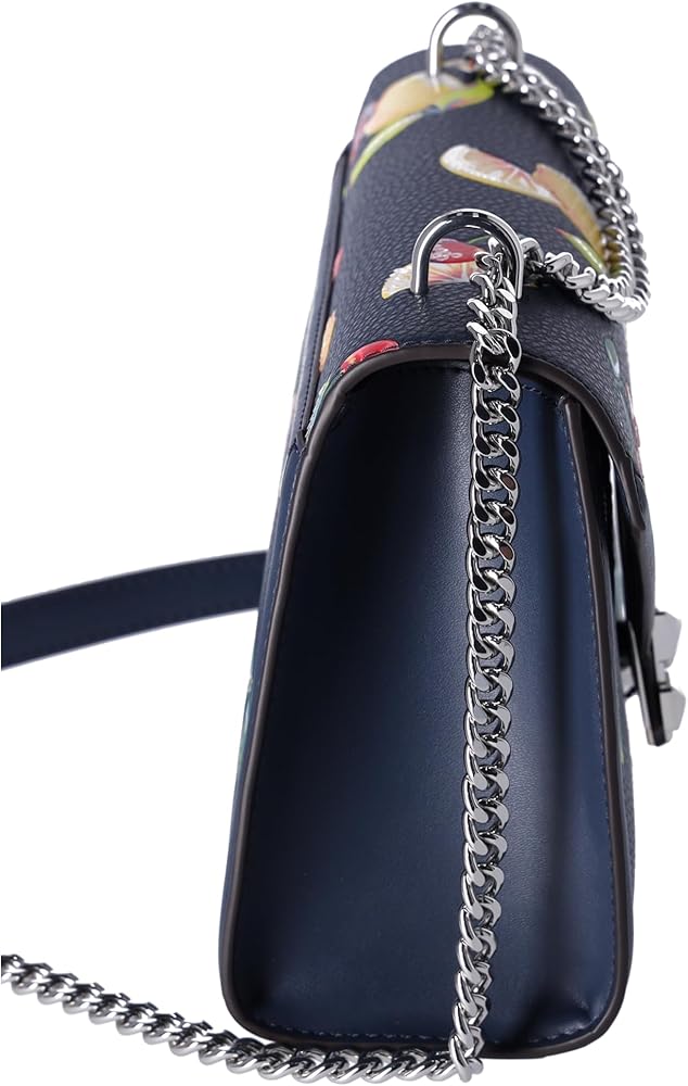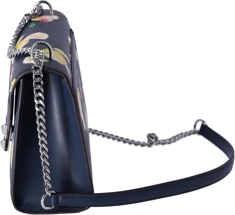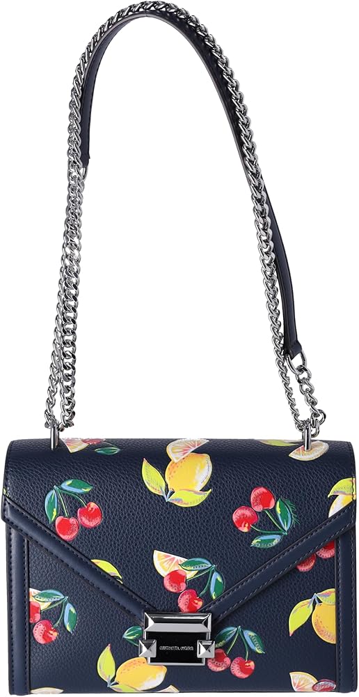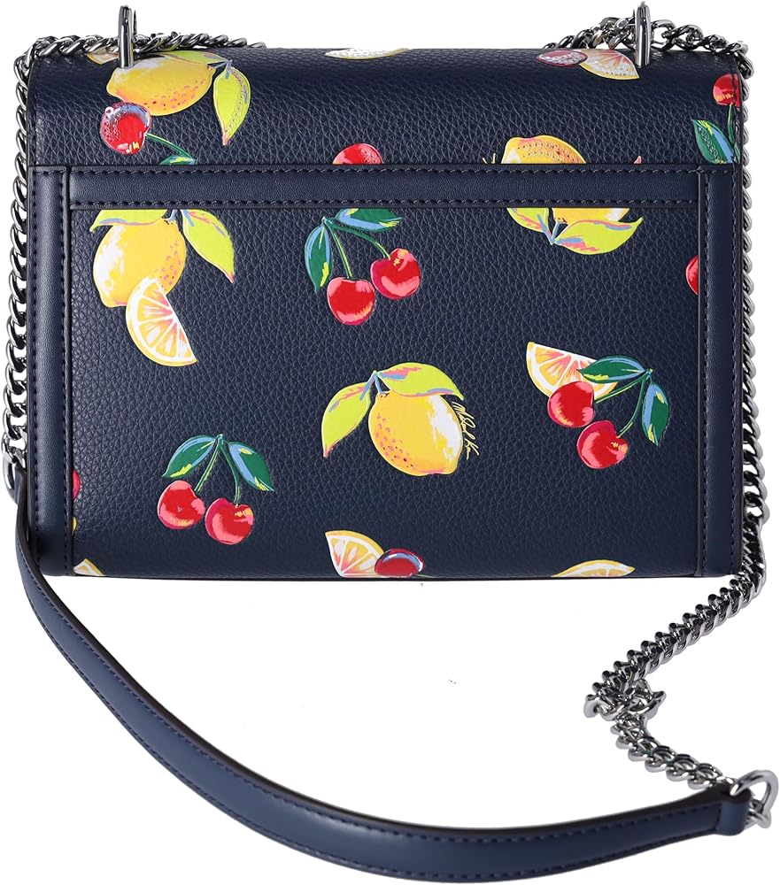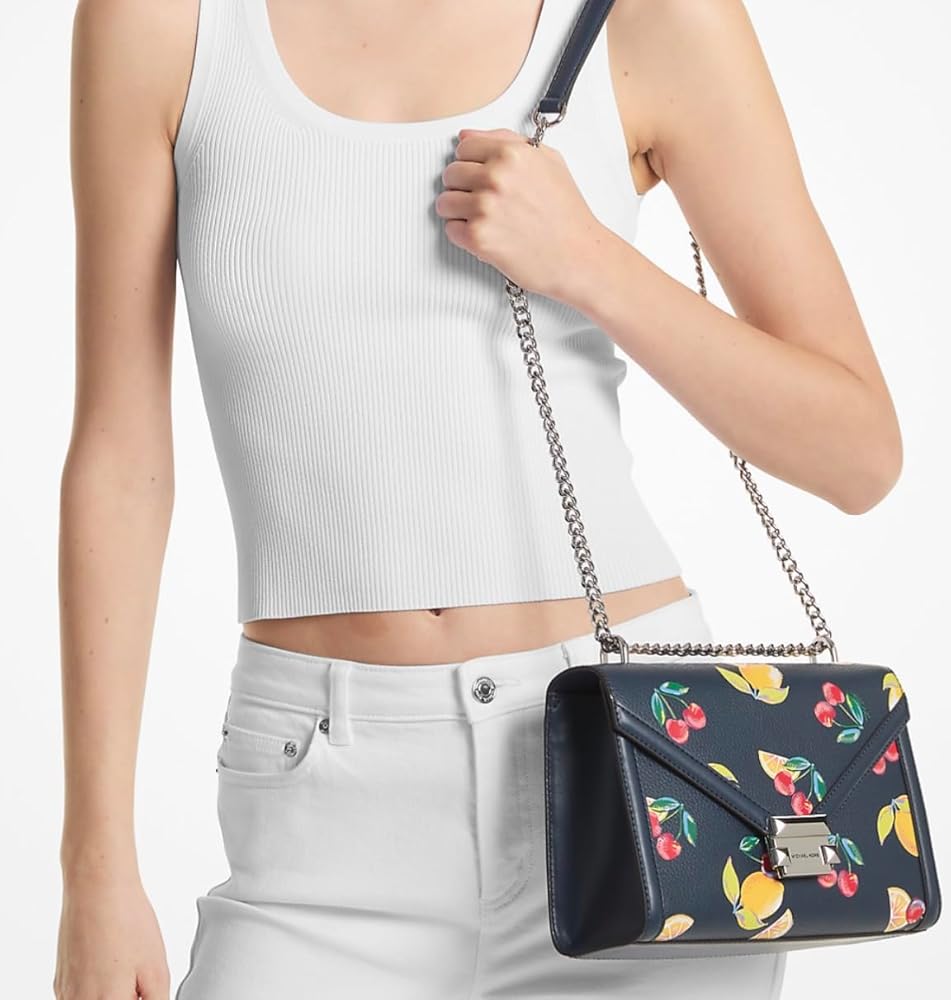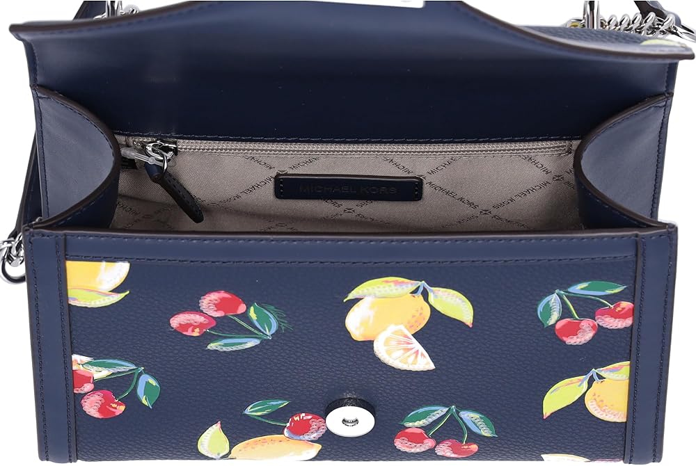 Michael Kors Whitney Medium Sequined Fruit Print Shoulder Bag Color: Navy Shoulder bag Polyurethane blend 60% polyurethane/20% cotton/20% polyester Gold-tone hardware 9.5"W X 7"H X 3.5"D Interior details: back slip pocket Lining: 100% polyester Snap fastening