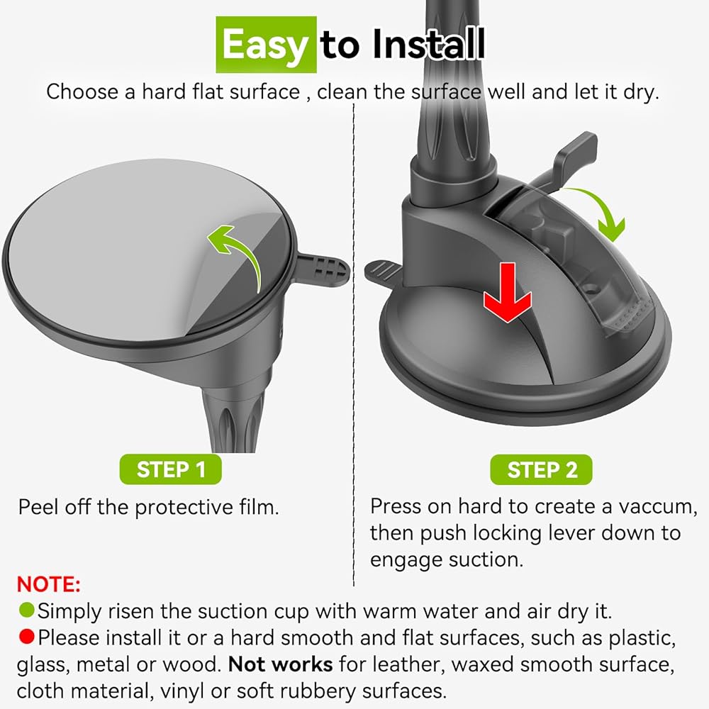 [Easy to Install] Choose a hard flat surface, then clean the surface well and let it dry. Remove the protective film form the suction cup, press the suction cup firmly on the surface, then push the locking lever. Tool-free installation.