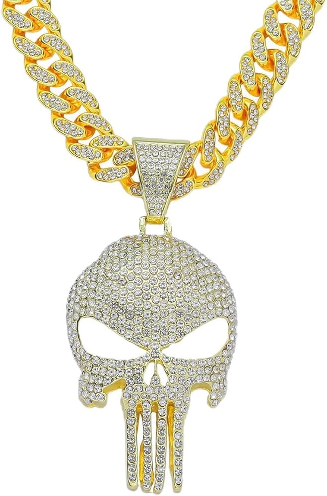 Cool Skull Necklace for Men Women, Halloween Necklace, Iced Out Cuban Chain Diamonds with Bling Skulls Pendant, Chunky Cubic Link Chains Necklaces, Unique Large Hip Hop Rhinestone Gifts, Mens Big Gold Plated Cosplay Costume Punk Gothic Goth Jewelry