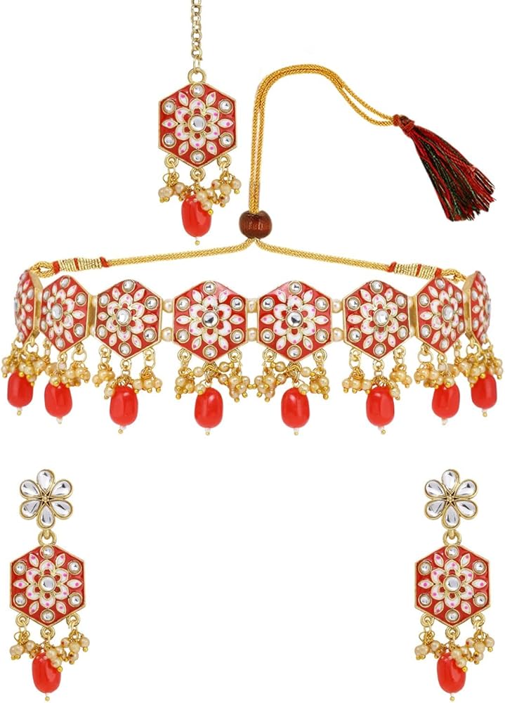 Efulgenz Indian Bridal Jewelry Set - Faux Kundan Crystal Choker Necklace, Jhumka Earrings, Maang Tikka Head Chain - Bollywood Fashion Wedding Bridal Jewelry For Women