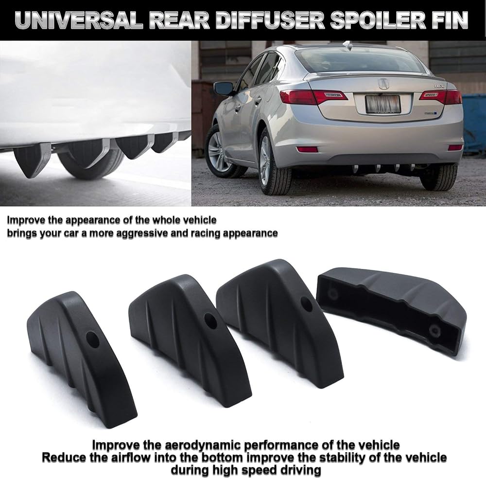 - One set (4 pieces) of rear lower diffuser spoiler fin, universal fit for most vehicle.