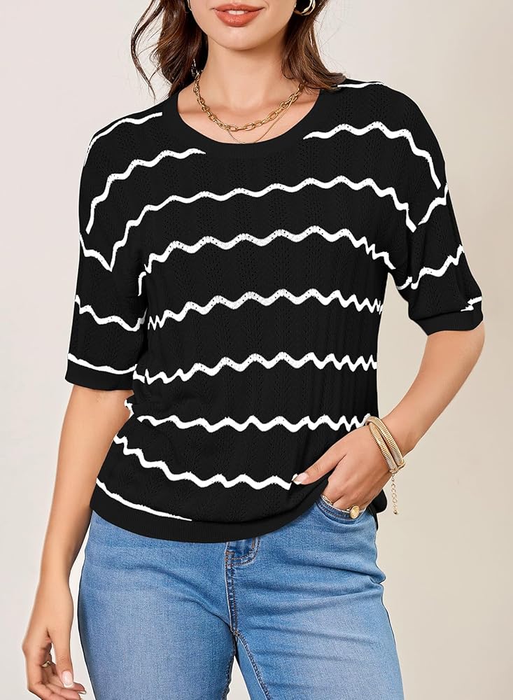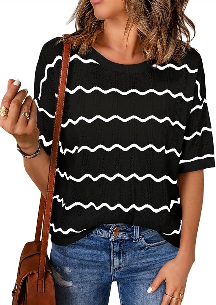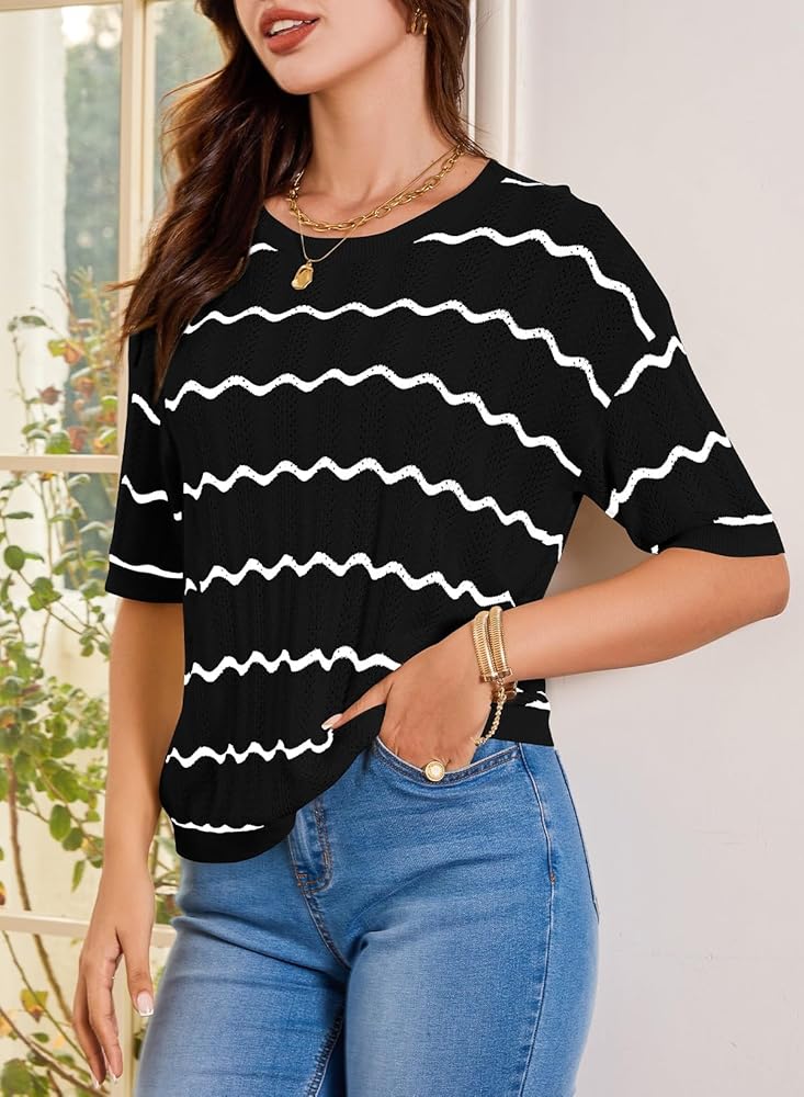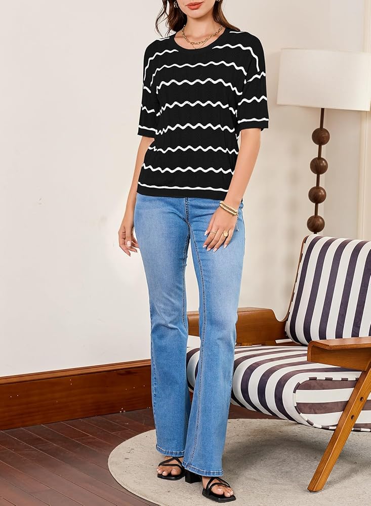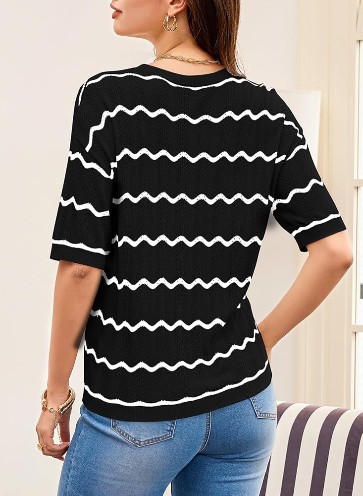 Feature:Summer Tops For Women 2025,Crew Neck,Short Sleeve,Knit Tops,Stripe Pattern,Slim Fit, Ribbed Cuff, Tunic and Lightweight Design