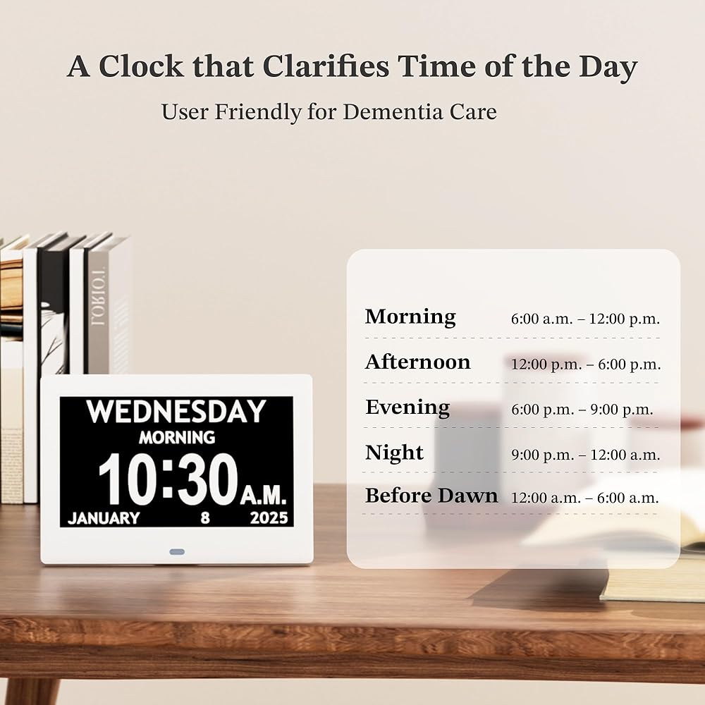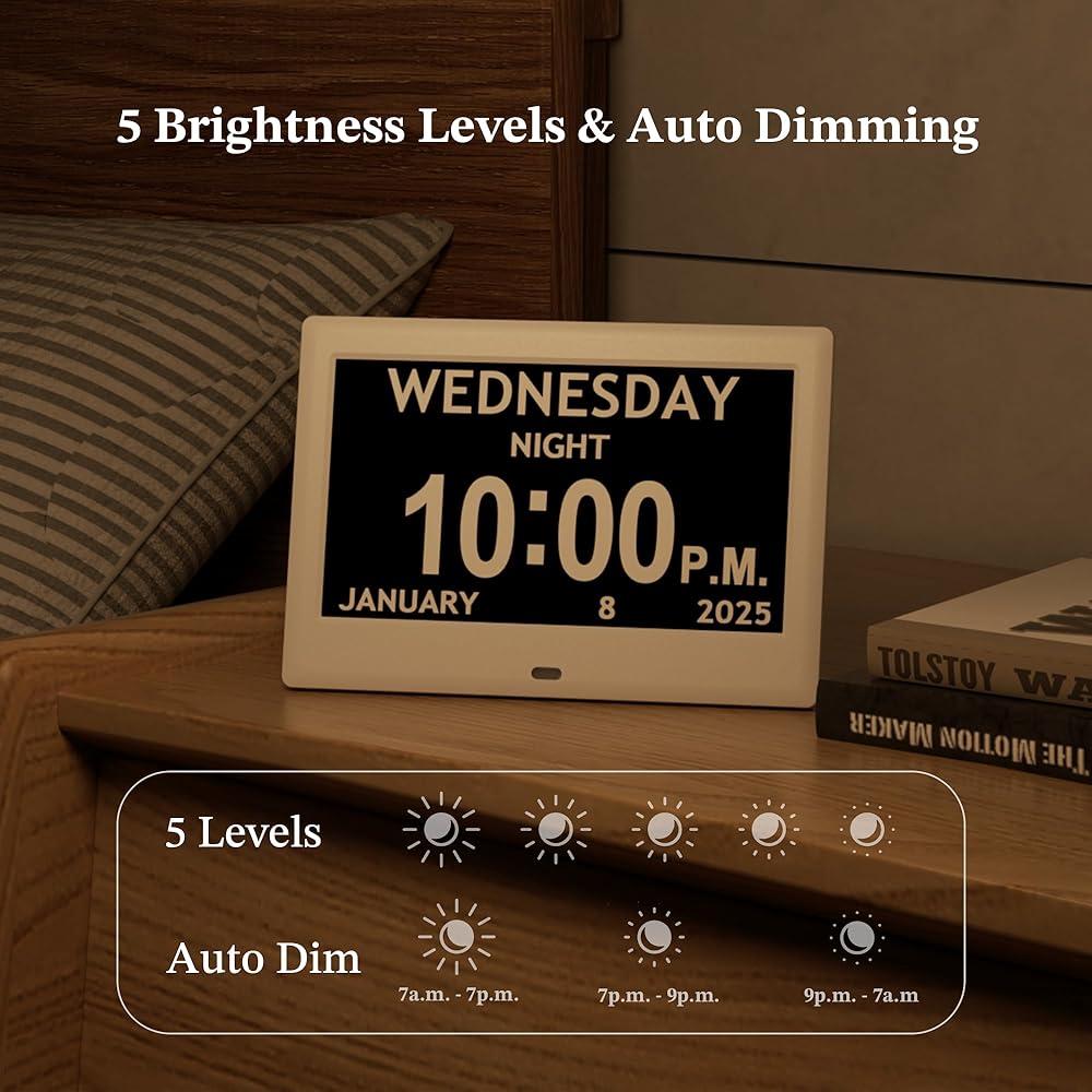 Clear and Easy-to-Read Display; The Pastigio 7-inch digital calendar clock features a high-resolution 1024x600 IPS screen, perfect for seniors who need a clock with date and time that's easy to read. Its large display with big numbers ensures that the day, date, and time are visible from across the room. Whether used as a digital wall clock or a desk clock, this dementia clock is ideal for elderly users and individuals with impaired vision, providing a clear and dependable timekeeping solution