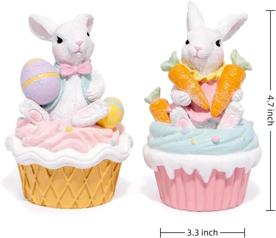 Hodao Easter Bunny Cupcake Figurines – A Delightful Addition to Your Easter Décor Celebrate the spirit of Easter with this charming set of Hodao Easter Bunny Cupcake Figurines. Each bunny features a unique pose sitting atop a beautifully designed cupcake base, complete with Easter-themed details like colorful eggs and vibrant carrots. These figurines are meticulously crafted from high-quality resin and hand-painted with soft pastel shades, capturing the essence of springtime cheer. The compact size (3.2” L x 3.2” W x 4.7” H) makes them perfect for decorating tabletops, mantels, shelves, or office desks. Whether you're hosting an Easter party, brightening up your living space, or gifting them to loved ones, these bunny figurines add a whimsical and heartwarming touch to any setting. Bring Home the Joy of Spring with Hodao's Easter Bunny Figurine Set Today!