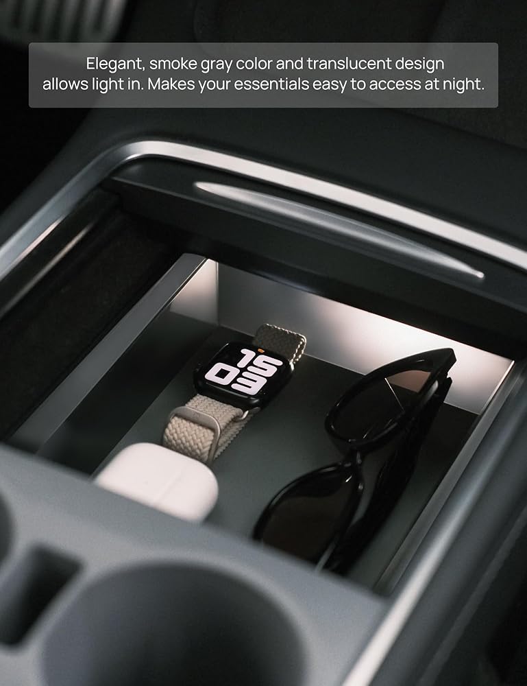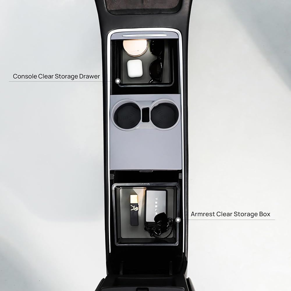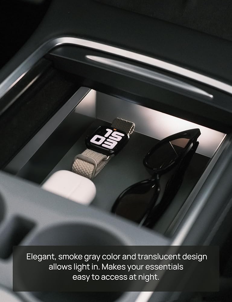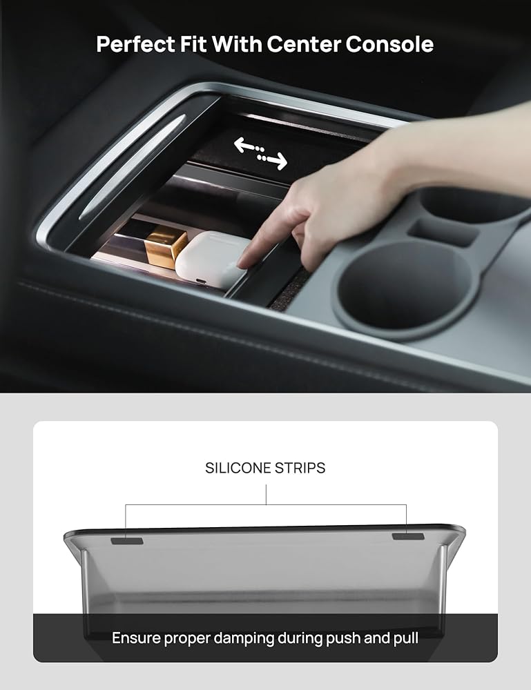 TPARTS Center Console Storage Drawer with Silicone Layer for Tesla Model Y (2021-2024) & Model 3 (2021-2023) Accessories Interior, Translucent Smoke Gray Organizer Tray, Maximize Storage Space