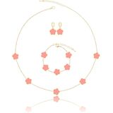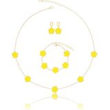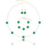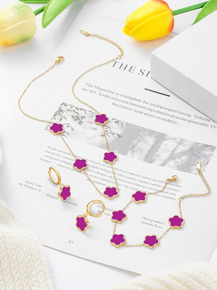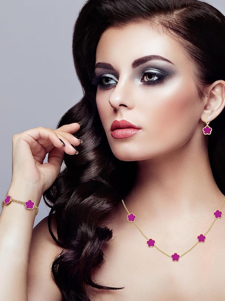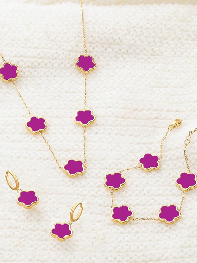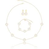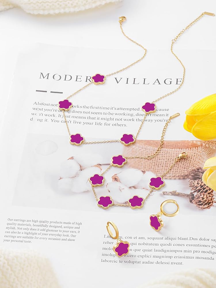 The Perfect Clover Bracelet Dangle Earrings and Necklace Set! These Handmade Stunning Necklace Bracelet and Earring Set Are Made with Plastic and Are Plated in 14K Glod to Ensure a Long Lasting Finish That is Nickel Free, Lead Free, and Hypoallergenic.