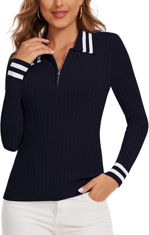 Women Long Sleeve Polo Sweater Features: Quarter Zip Polo Sweaters/ Ribbed Knit Golf Tops features Striped Color Block design, with excellent color combinations that make the entire polo sweater looks very elegant and exquisite. The versatile 1/4 zip v neck design make this sweate is suitable for everyday wear