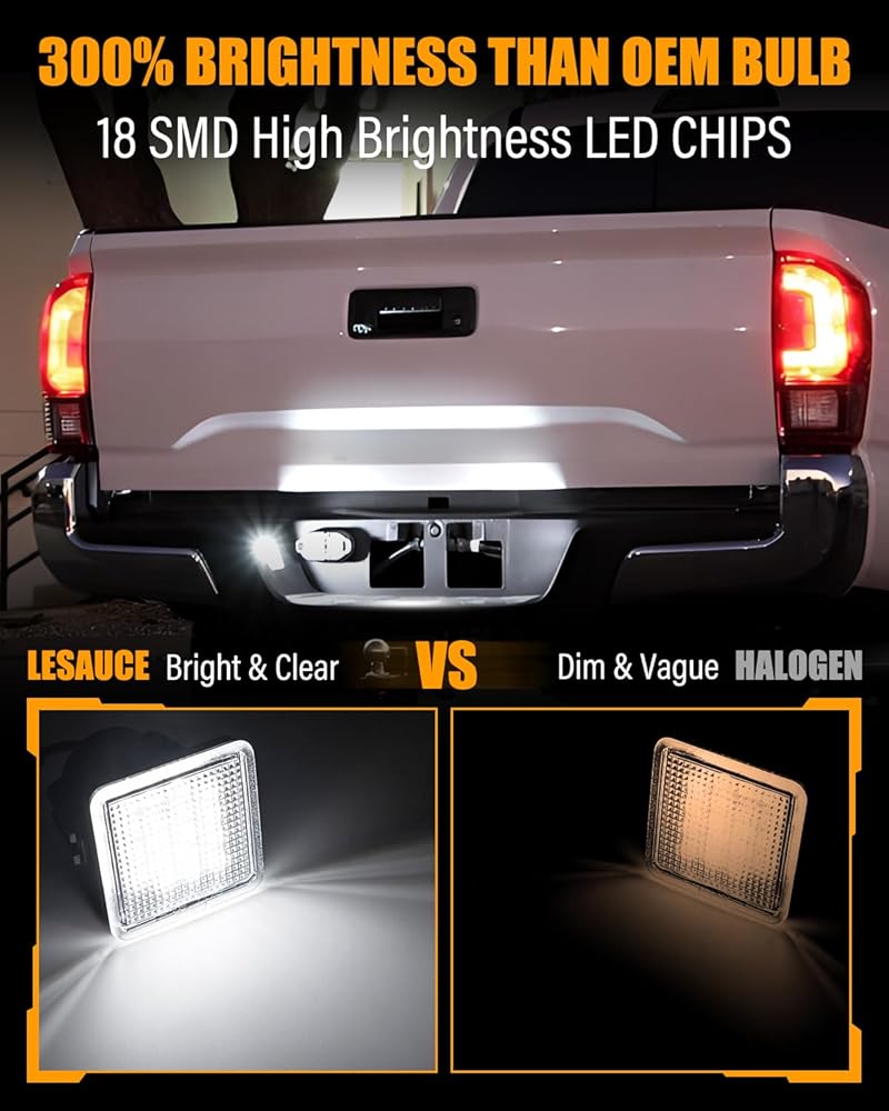 【Significant Improvement in Brightness】Each LESAUCE LED license plate bulb for toyota tundra is equipped with newest SMD LED chips, providing 6000k pure white and 300% Brightness than OEM bulbs, ensuring excellent visibility in low light conditions, especially at night. Say goodbye to nighttime reversing struggles caused by dim lighting