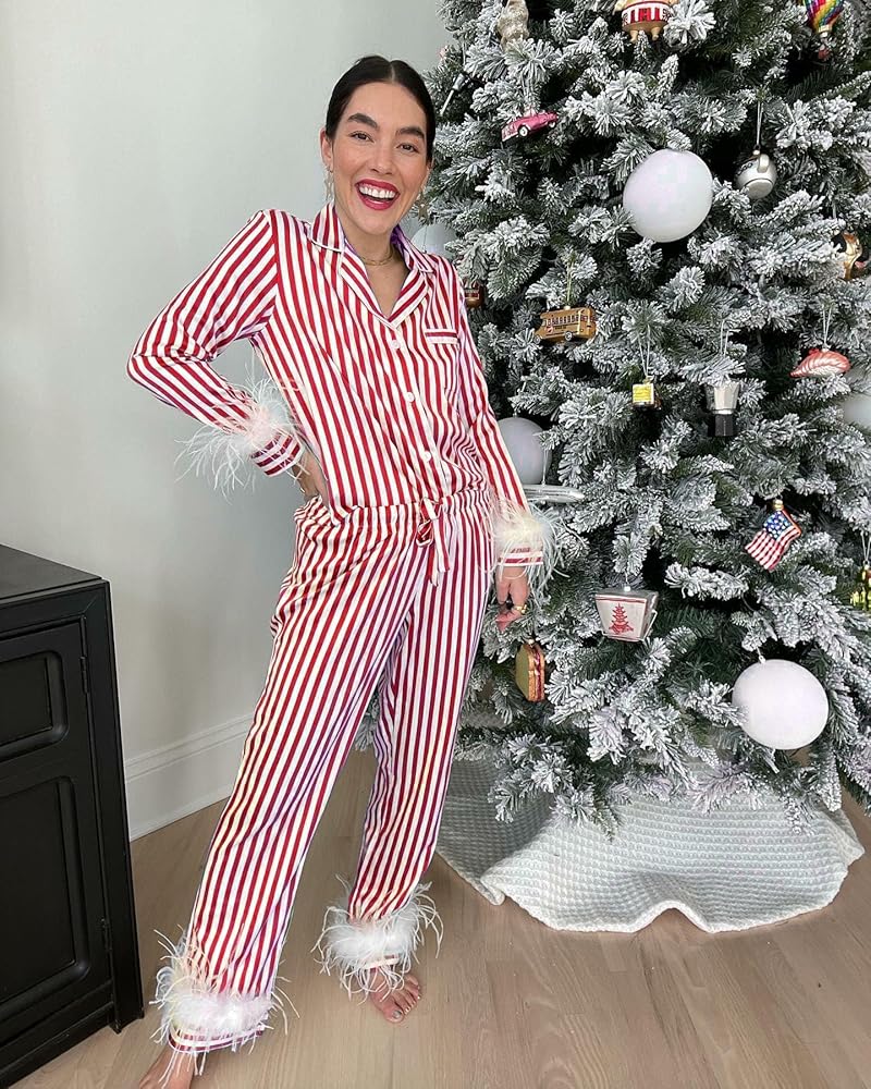 Present: Christmas striped pajama for women pants, great to style with headband, christmas socks, beanie or slippers. Xmas sleep sets for women are a beautiful present for Christmas Day, Birthday, anniversary or Valentine's Day