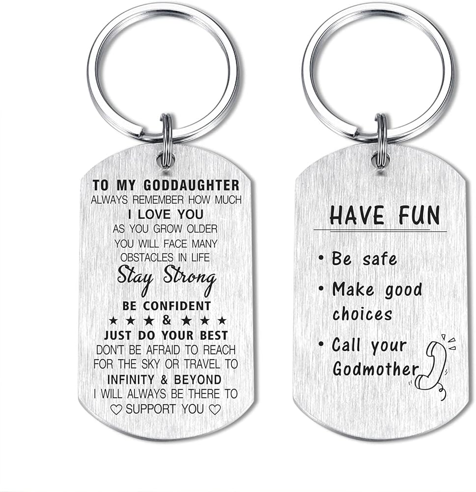 Double Side Engraved Keychain - Made with Stainless Steel, Lead-Free and Nickel-Free. Pendant Size 2”* 1.2”. One side with encouragement love message for goddaughter, the other side with funny rules from godmother