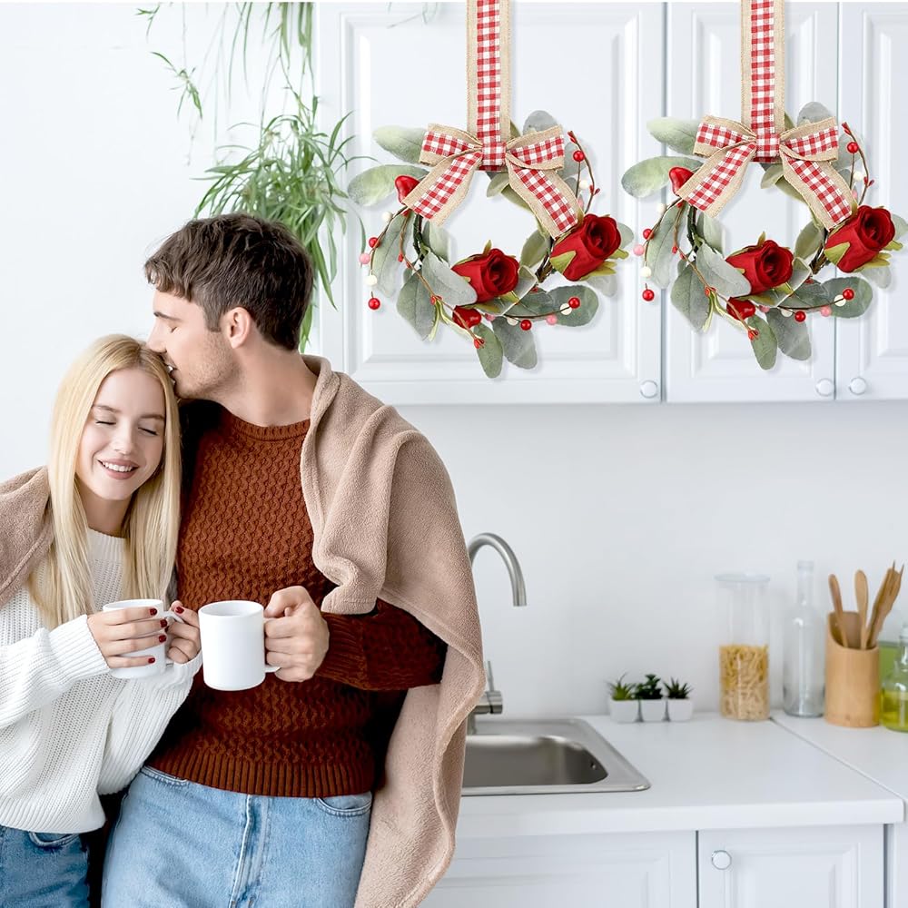 Adorable Valentine's Day Decor: these cabinet wreaths for kitchen come with artificial leaves, small berries and buffalo plaid bows, delicate in appearance, suitable for indoor and outdoor decoration, bringing you a pleasant visual feeling