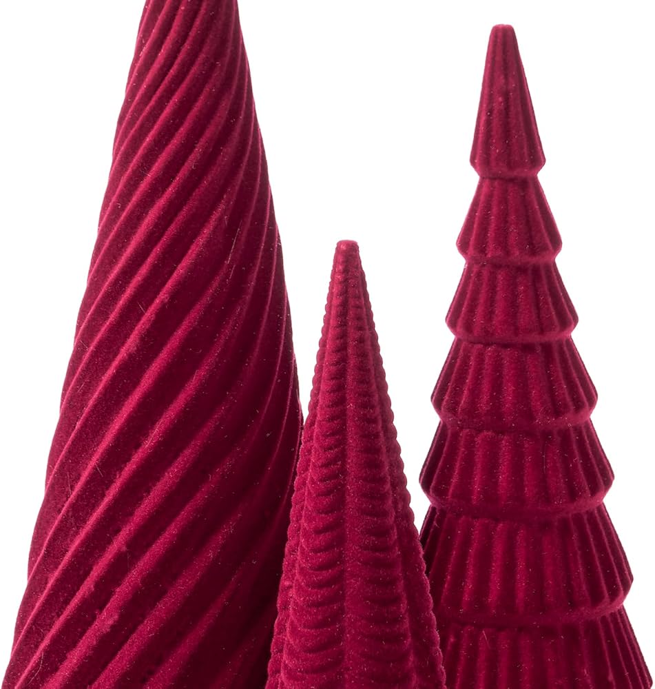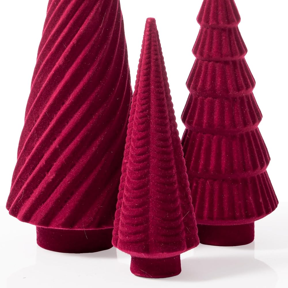 DN DECONATION 3Pcs Flocked Red Velvet Table Top Christmas Tree, Resin Xmas Tree Figurine Decor with Pine, Swirl & Wave Designs, Tree Statues Set for Christmas Indoor Decorations, Mantel, Entryway