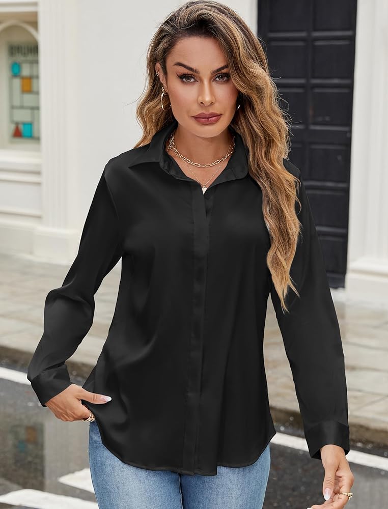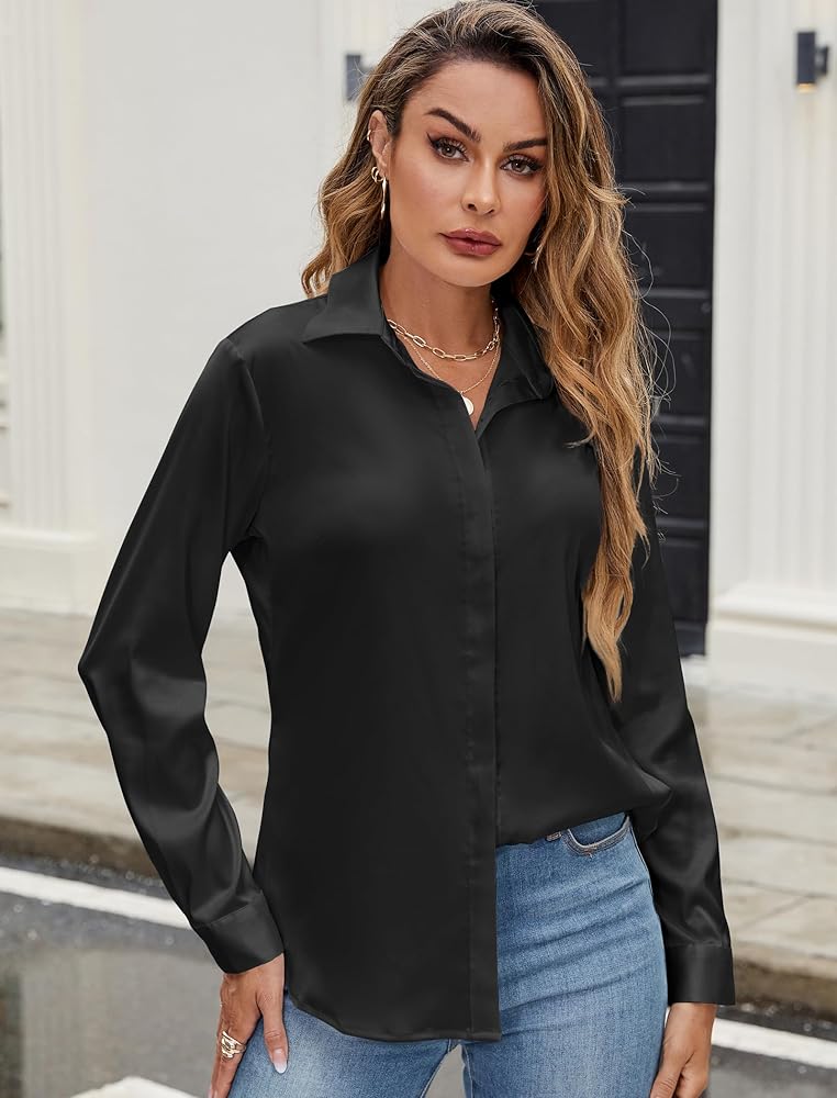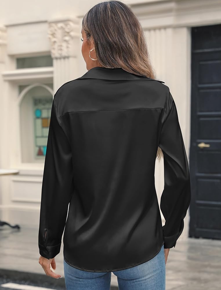 Match: Perfect for layering or alone, silk satin long sleeve shirts for women add a stylish and versatile touch to your wardrobe. It can be paired with your favorite blazer, pants, cardigans, leggings, suit jackets, shorts, sandals, jewelry, and bag, showing a good fashion style.
