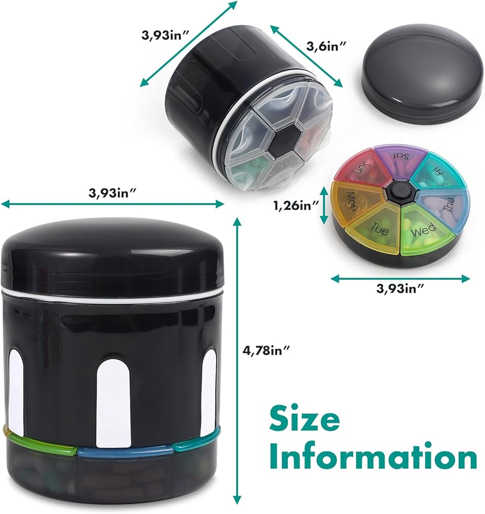 For Travel or Home Use: The detachable design provides more flexibility. The rainbow 7 compartments pill box is portable for travel and can meet your daily or weekly med needs. It is small enough to fit in your pocket, bag, or suitcase. (Product size: 3.93" x 3.93" x 4.78". Large 6 compartment size: 3.93" x 3.93" x 3.93". Rainbow 7 compartment size: 3.93" x 3.93" x 1.26". )