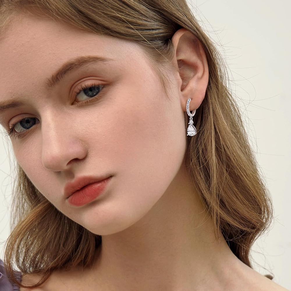 Hoop Earrings with Dangle Charm Sterling Silver Cz Teardrop Dangle Earrings Pear Drop Huggie Hoop Earrings Bridal Wedding Sparkling Crystal Jewelry for Women Mother's Day Gifts for Mom Daughter