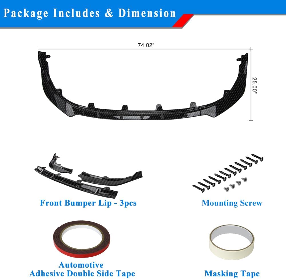 Package Includes: Front Bumper Lip (3 pcs) x 1 set, Double-Sided Adhesive Tape x 1 pcs, Masking Tape x 1 pcs, Mounting Screw x 1 pack