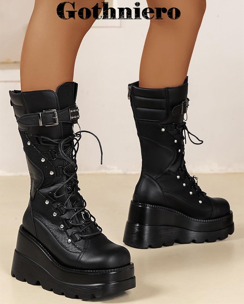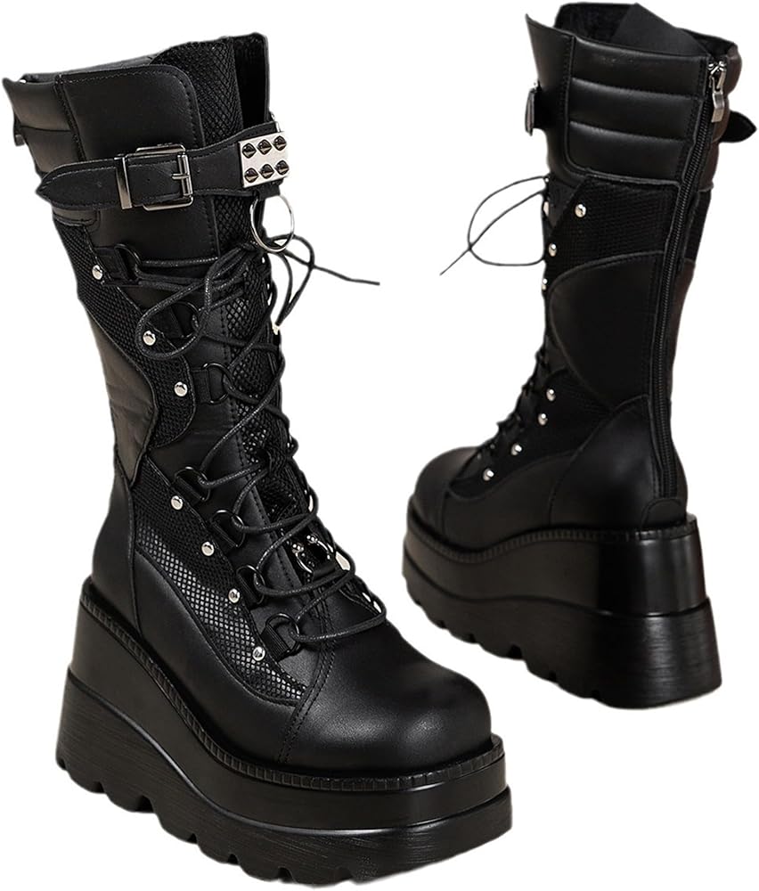 Gothniero Women Black Platform Goth Boots Mid Calf with Heel Knee High Boots Winter Chunky Heel Punk Rave Boots Girls Lace Up Combat Booties Size 5.5-11