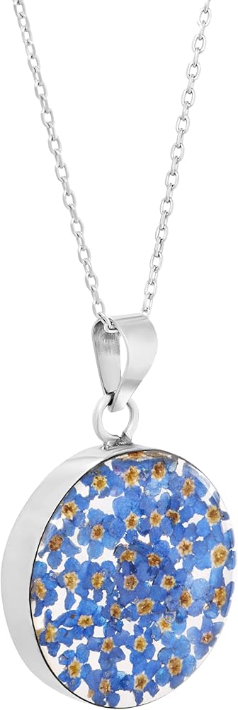 STYLE: Unique translucent round pendant necklace features real dried flowers preserved in resin and surrounded by sterling silver setting on a 16" cable chain with a spring-ring clasp. The natural properties of real flowers provides a one-of-a-kind look to each piece. The image may show a slight difference to the actual flowers in color and composition.