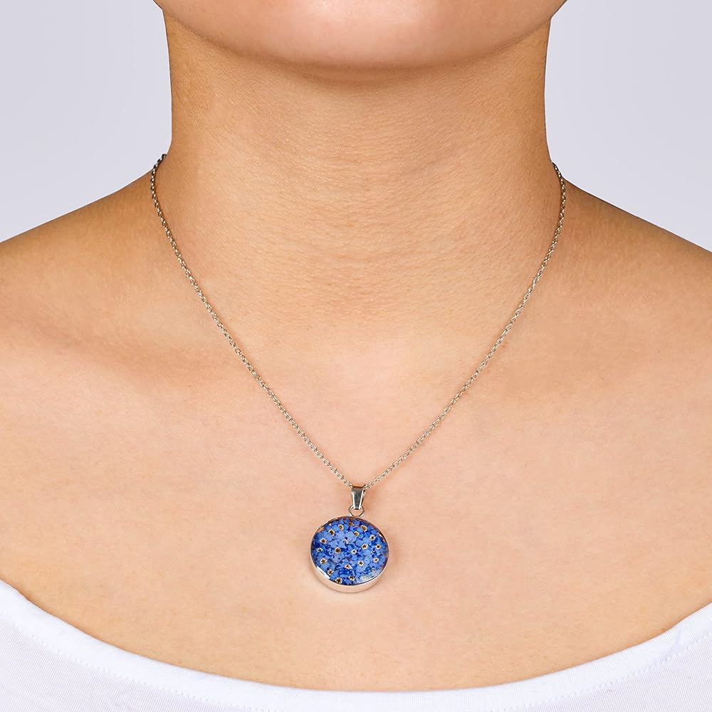 MATERIAL: Blue pressed flowers round pendant necklace is crafted in sterling silver with rhodium overlay to prevent tarnishing.