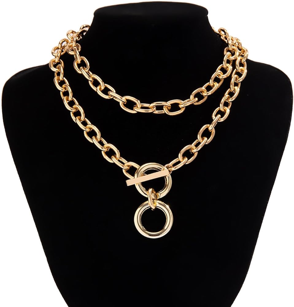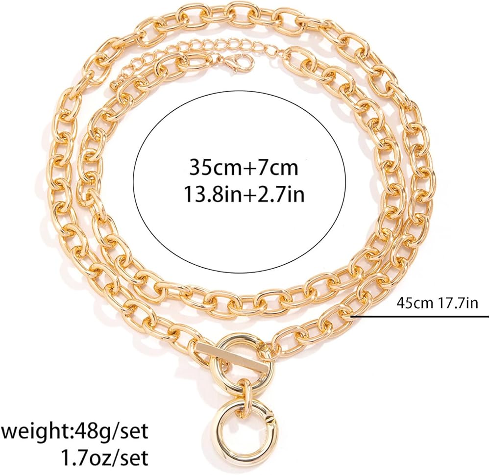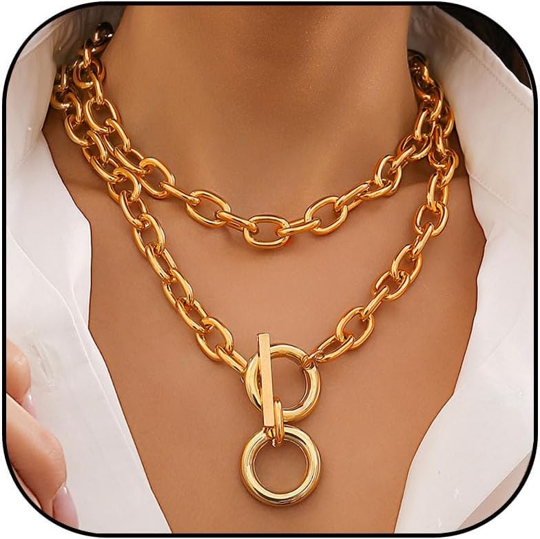 Chunky Choker Necklaces for Women 14K Gold Plated Layered Necklace Punk Thick Chain Necklace Dainty Round Pendant Toggle Necklaces Paperclip Necklace Gifts for Women