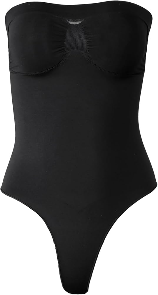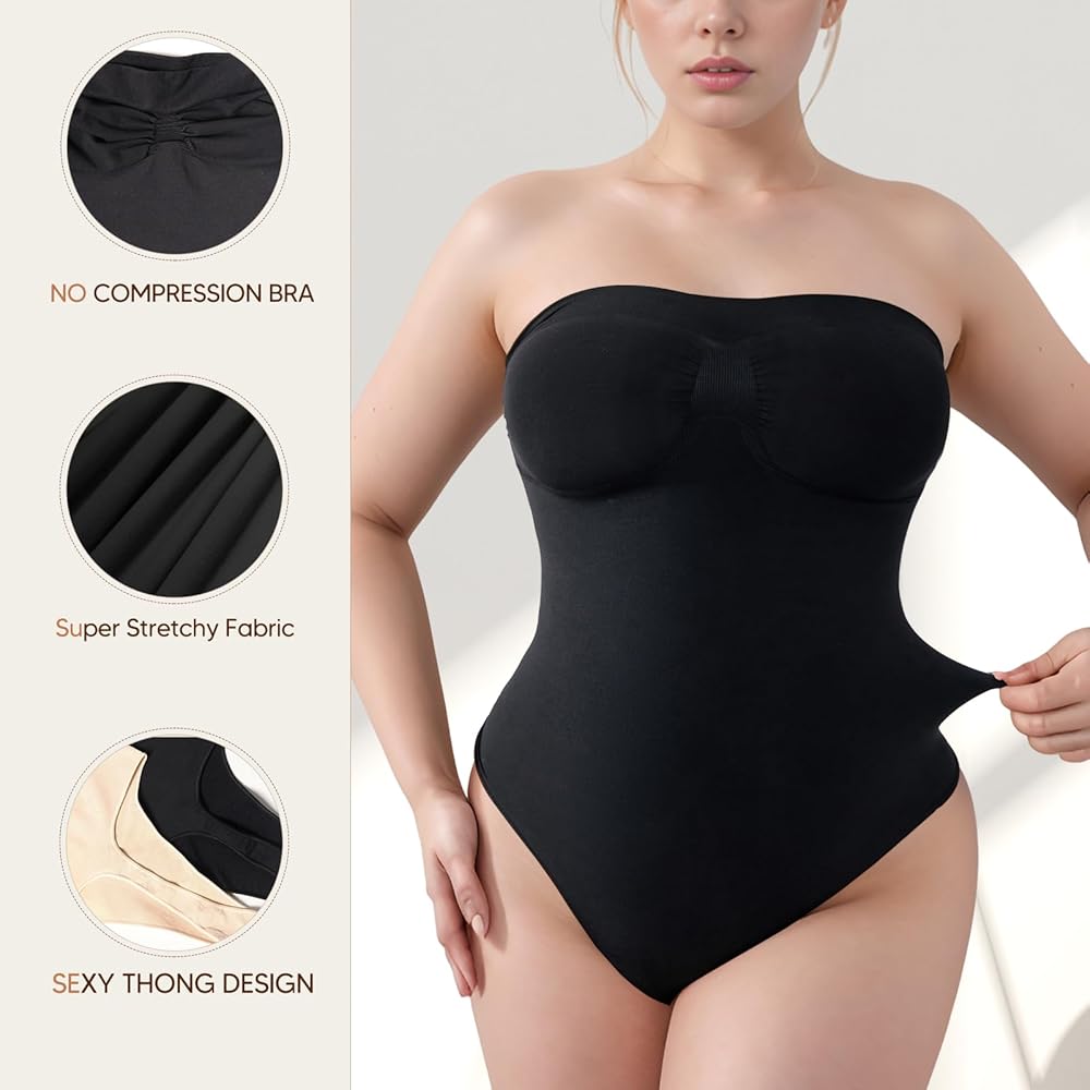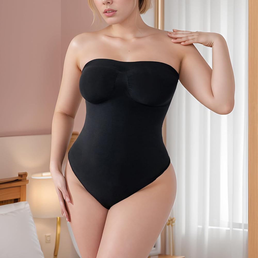 ✨NO COMPRESSION BRA✨ Designed with pique stitching, this strapless shapewear thong bodysuit not only provides excellent bust support but also fits all cup sizes. Whether it's a bra or a strapless bra, this tummy control tube top bodysuit works perfectly together. Center seams on the front and sides are designed to define and support the bust, keeping you in tip-top shape whether you're sitting still or moving.