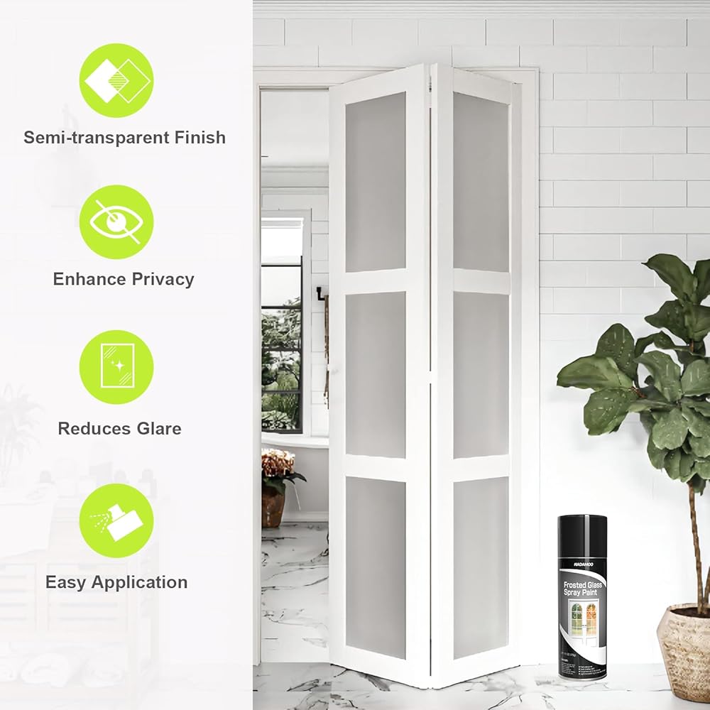 White Translucent Paint for Increased Privacy - Our spray paint will cearte a white semi-transparent frosted coating on glass surfaces. Provides privacy, prevents people from seeing in and out of the glass while still let comfortable natural light through surface.