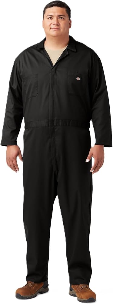 Stay covered and comfortable no matter the working conditions in these Men's FLEX Long Sleeve Coveralls. Our Temp-iQ® intelligent cooling technology adapts to your body temperature to keep you cool when the job heats up, with moisture wicking for improved breathability so you stay dry all day. Dickies FLEX fabric offers generous freedom of movement, along with the bi-swing back for added mobility, and elastic waist inserts at the sides. A sturdy 2-way front zipper and concealed snaps at the waist, collar, and chest pockets are built to last. Secure your valuables in the large back pockets with button closure.
