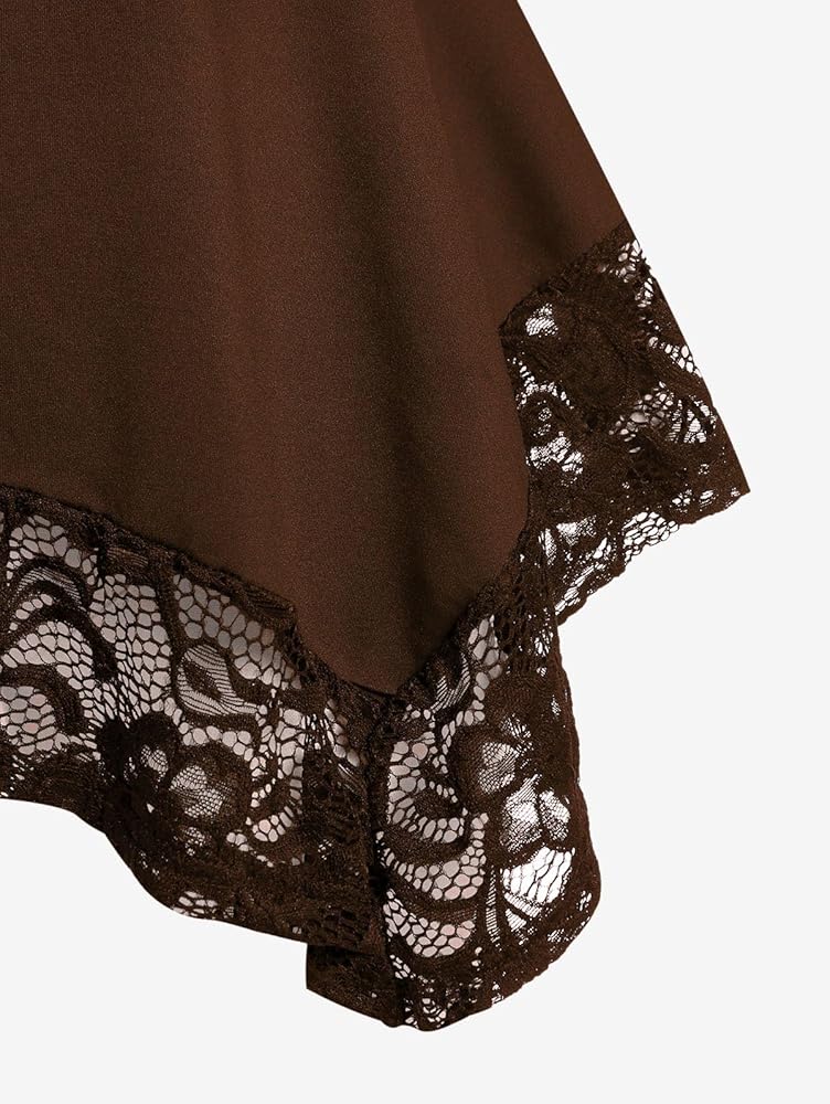 Design: This lace swing top looks beautiful, This shirt is soft, flowy, and in a beautiful color. You get compliments when your wear it. The loose fabric at the bottom doesn't bunch or stick out. It fell off nicely and covered your stomach.