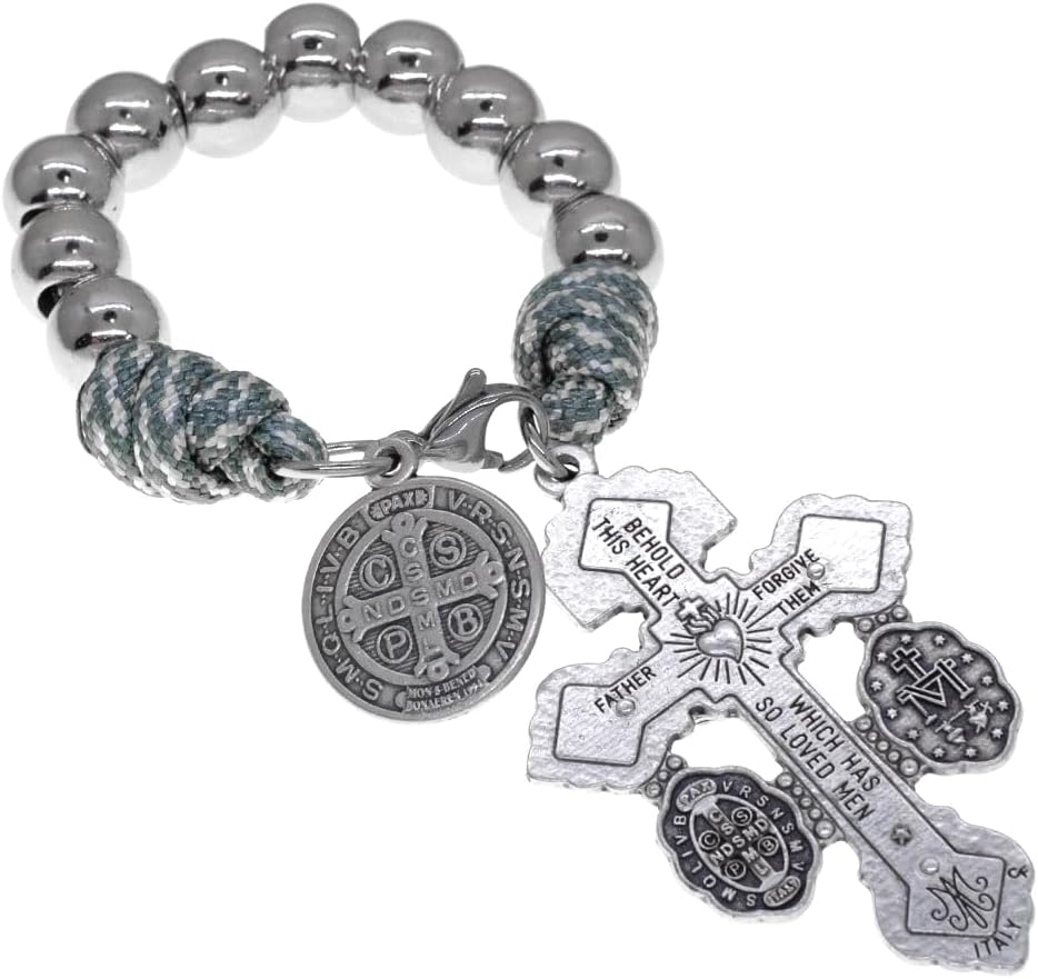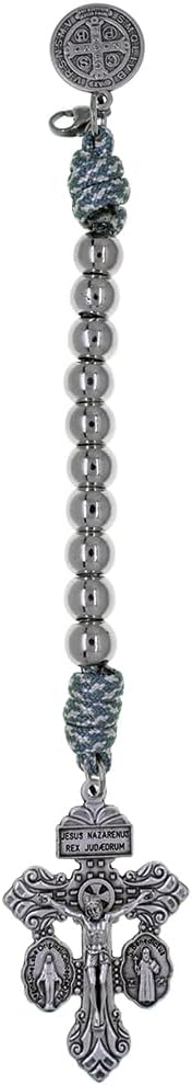 This pocket rosary has a lobster claw clip and can easily be hooked to a zipper on a purse, backpack, or briefcase. The powerful crucifix on this decade rosary features a Miraculous Medal and St. Benedict Medal on either side. The back of the cross says "Behold this heart which has so loved men". The St. Benedict Medal features a prayer asking God for protection against evil through the intercession of St. Benedict. He is also the Patron Saint of Students and Europe. Use this decade rosary strand to pray the rosary while you're on the go! It also makes a great gift for First Holy Communion, Confirmation, Ordination, Birthdays, Easter, and Christmas. Know it will last and be cherished for years to come.