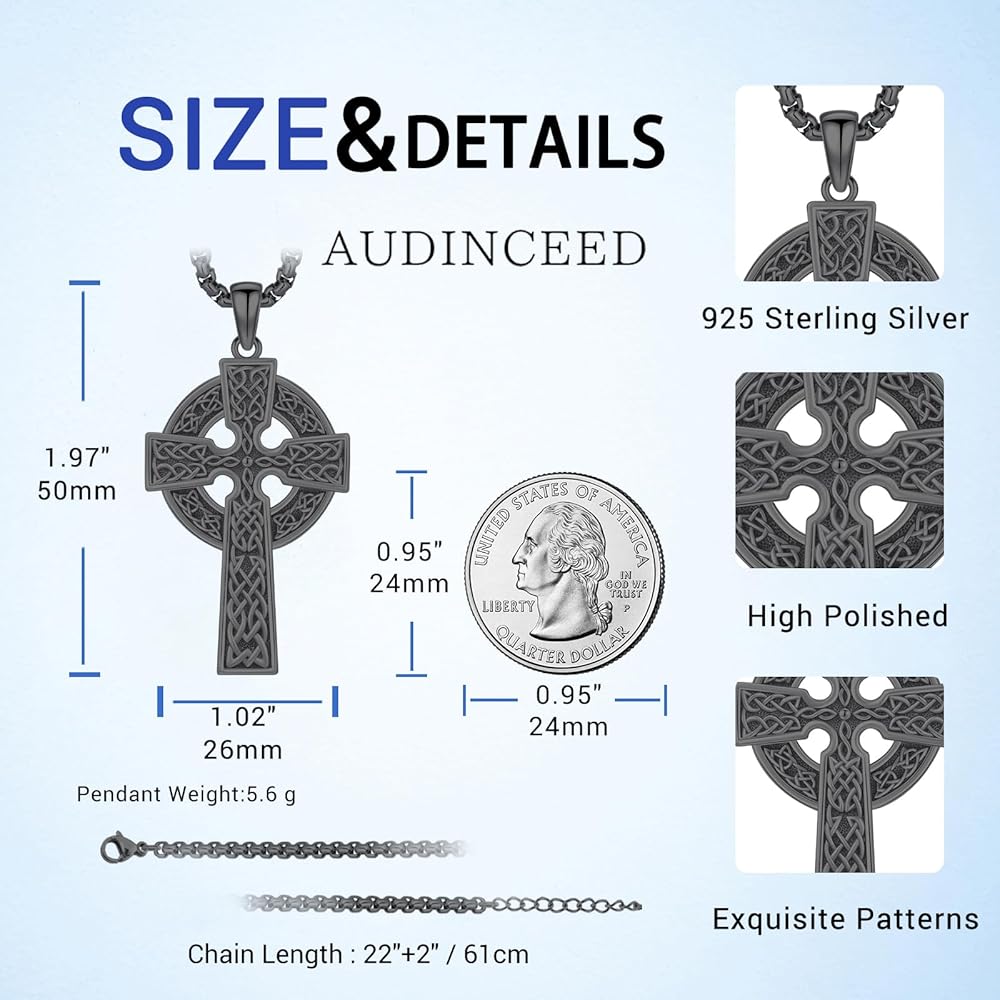 Celtic Cross Jewelry: Cross pendant size: 50*26mm/1.97*1.02in, chain length: 22inches +2inches extension; 2.0mm width , weight: 7.4g/0.26oz. Package detail: 1x gift box,1x 925 sterling silver cross pendant,1x stainless steel chain,1x silver polishing cloth. Elevate your look with this versatile and eye-catching piece of celtic cross jewelry, perfect graduation gifts for men women