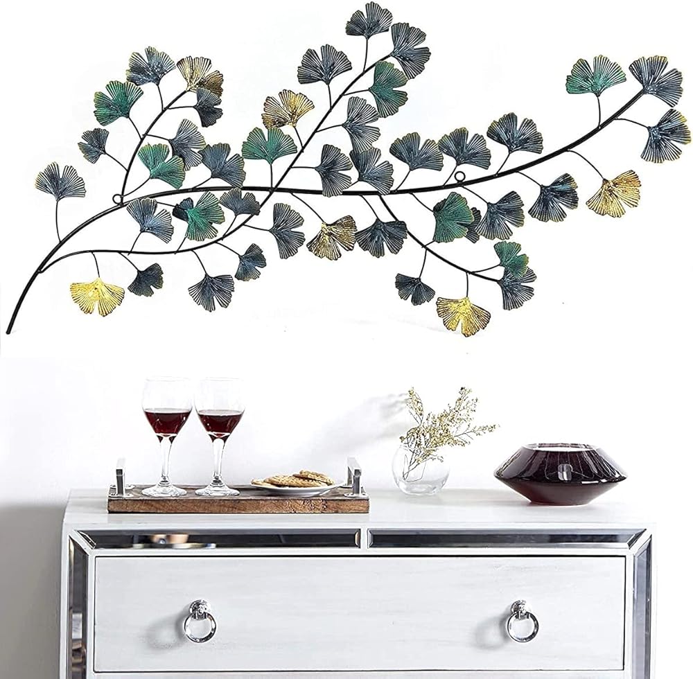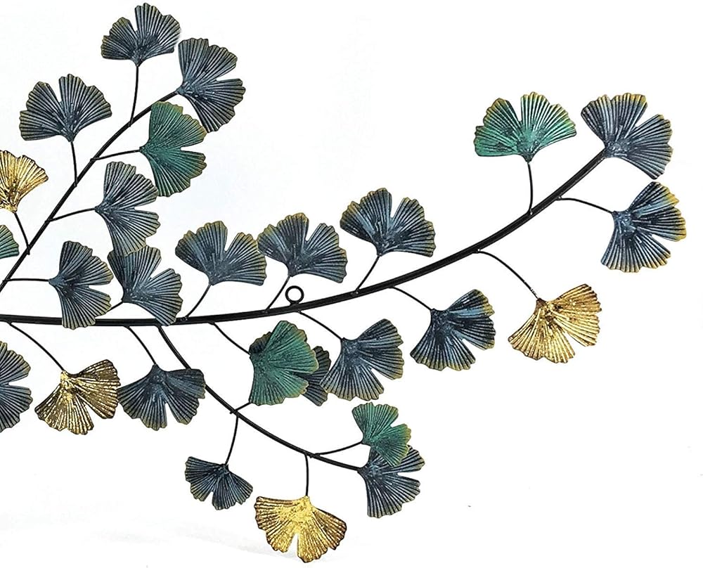 Bellaa 3D Metal Wall Decor Living Room Ginkgo Leaf Japanes Style Flower Golden Blue Teal Abstract Scroll Celtic Wrought Iron Plaque Hanging Boho Home Outdoor Garden Floral Accents Turquoise