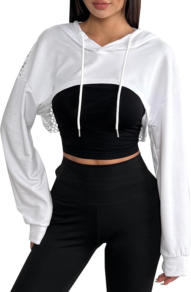 Features: Pullover sweatshirt features with drawstring, sexy fishnet, bolero sweatshirt, long sleeve crop top it was a go to for covering your arms and head for warmth, shrug hooded sweatshirt the crop is short enough to show off your cute under layers without being too restrictive around the arms, pullover sweatshirts for women show off your charming curves, crop bolero sweatshirt