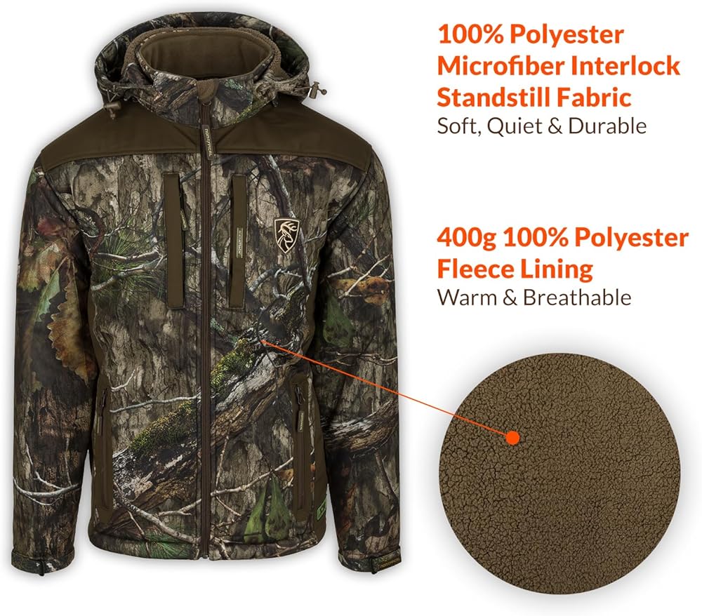 • ADVANCED MATERIALS - Featuring incredibly soft, yet extremely durable outer fabric, the Standstill Windproof camo hunting jacket is perfect for late-season hunting when mornings start cold and warm up during the walkout; This men's game hunting jacket combines 100% polyester microfiber interlock standstill fabric with a 400-gram polyester fleece backing, ensuring maximum warmth & breathability with minimum bulk