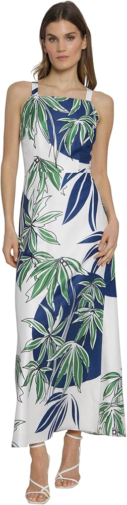Sleeveless square neck dress featuring a fitted bodice, cinched waist, and flowing A-line maxi dress skirt with a small side slit, crafted from lightweight woven fabric with an allover tropical leaf pattern creating vertical stripes.
