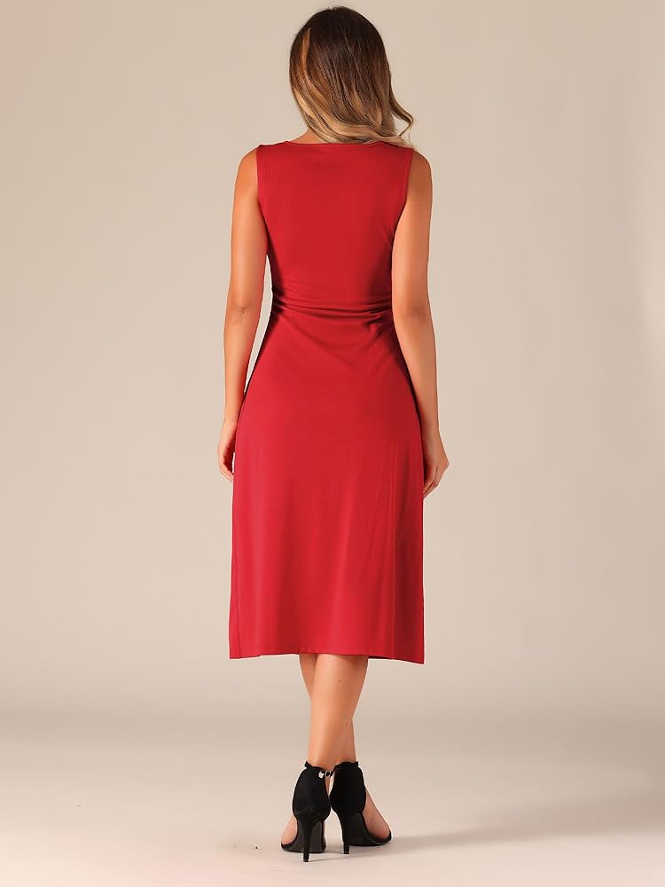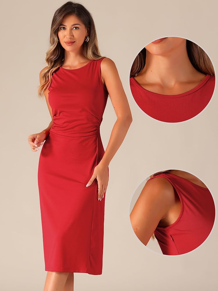 - This tank dress is made up of several design points: crew neck, ruched, sleeveless, A-line, hidden side zipper, midi, solid, unlined.