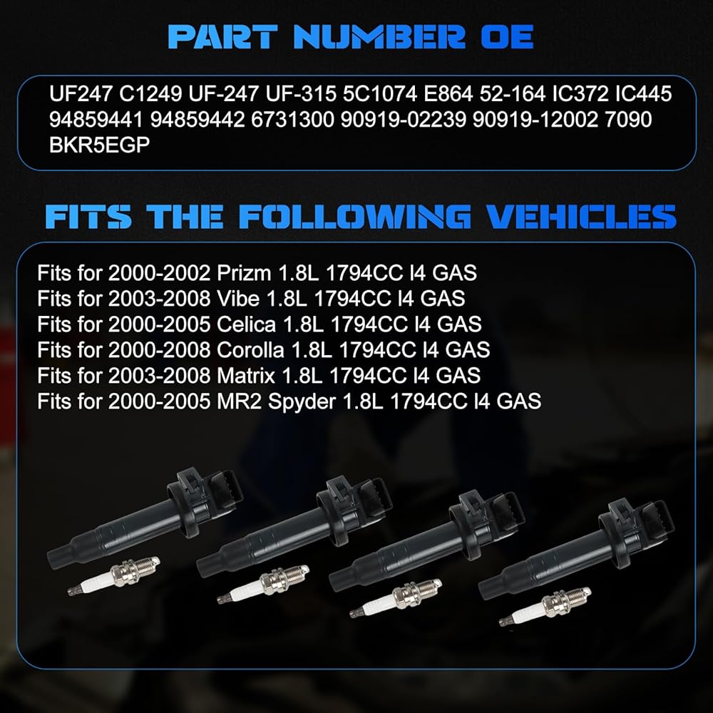 【High Performance】: Premium quality ignition coils utilize advanced technology and materials for high efficiency and outstanding reliability. Ignition coils provide powerful ignition capability to ensure proper engine starting and running. They can work under various working conditions and have a long service life