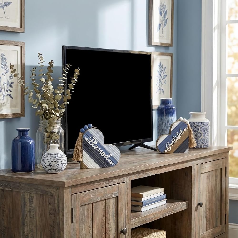 Valery Madelyn Valentines Day Decorations, 2 Pcs Rustic Table Decorations for Living Room, Farmhouse Wooden Table Centerpiece, Wooden Heart Decor for Home Dining Room Kitchen Shelf, Blue and White