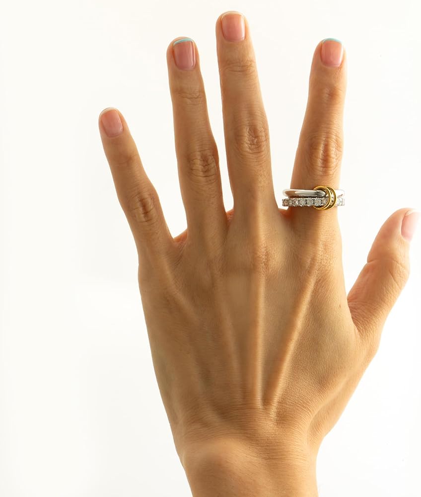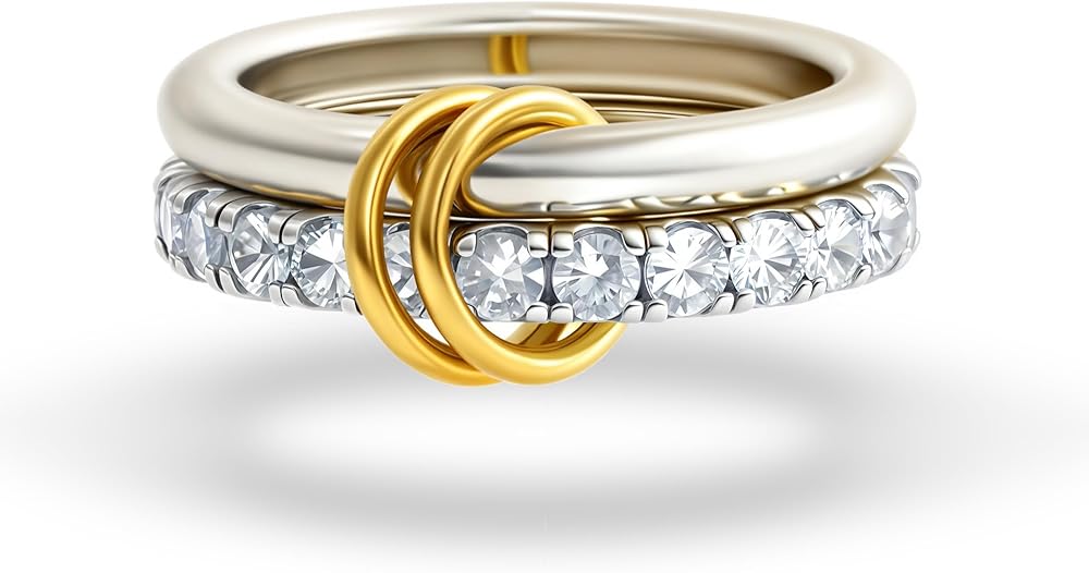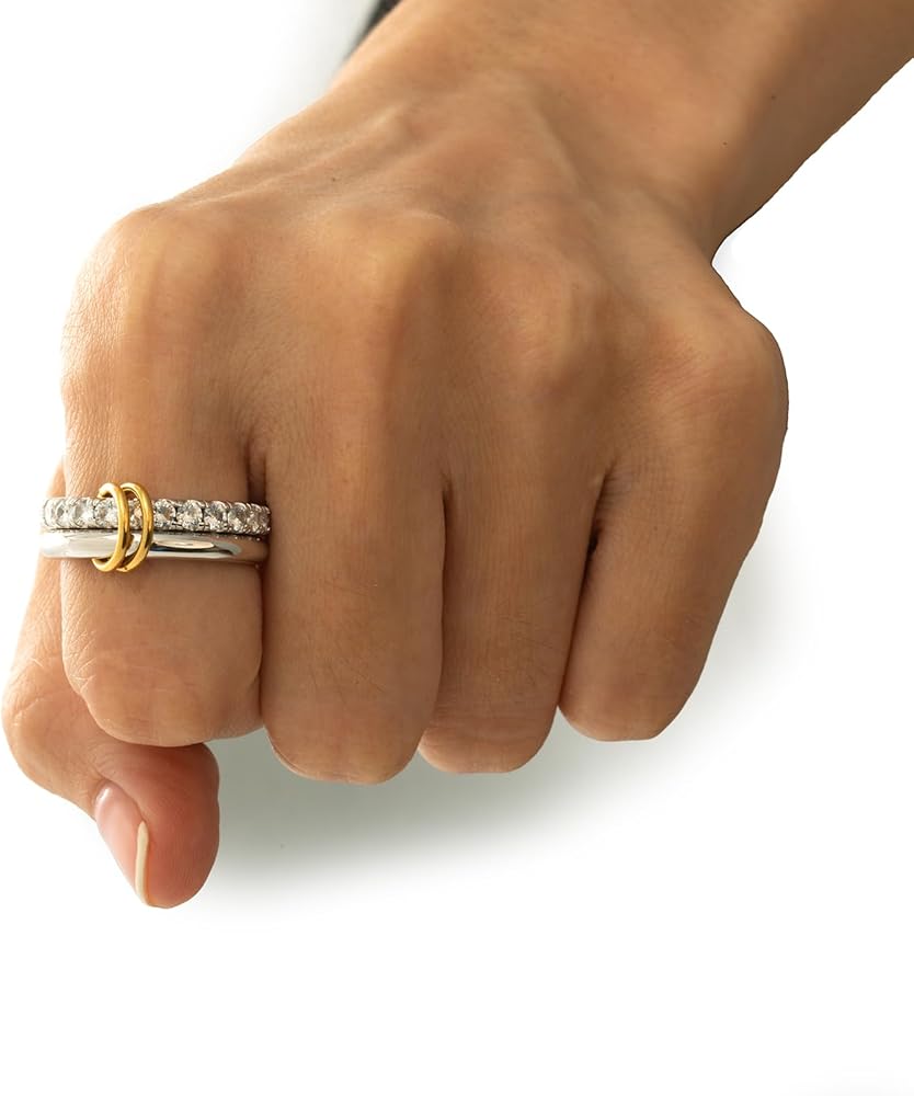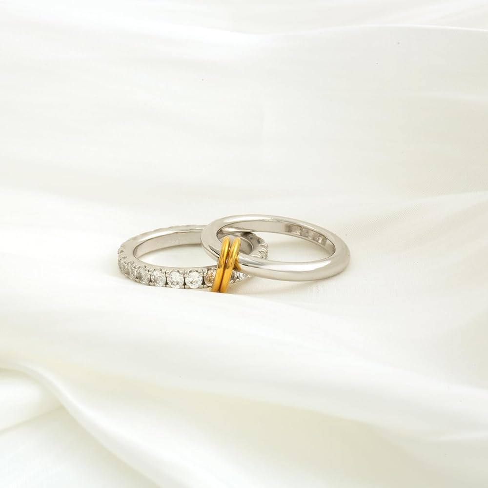 [Silver Rings for Women] - Our Connected Ring Set consists of one silver cubic zirconia ring and one silver ring connected by two small gold rings. It can be worn in different ways and actually uses shiny CZ stones