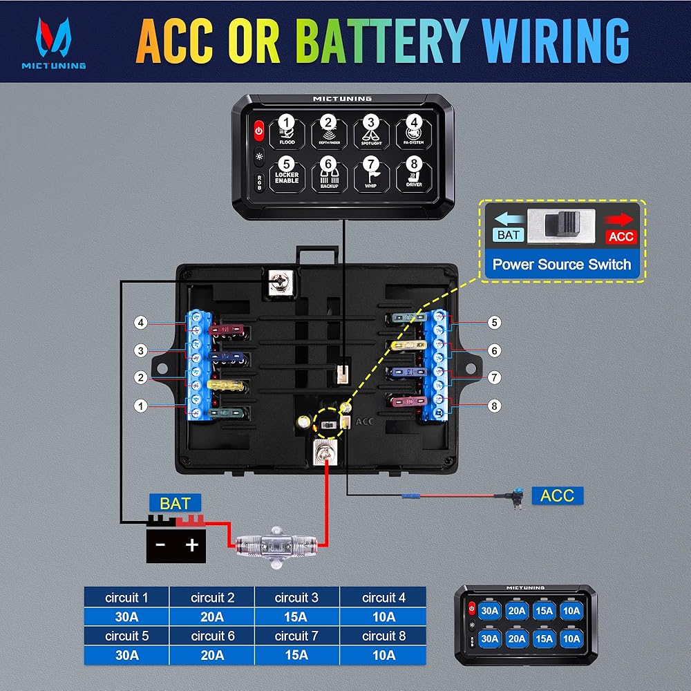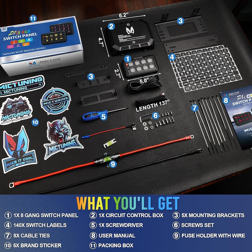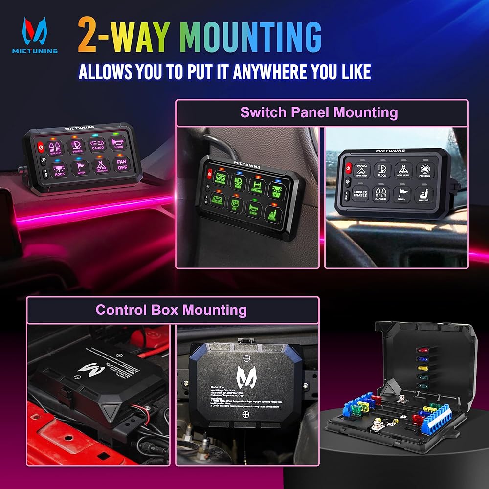 3 SILICONE FUNCTION BUTTONS: MICTUNING P1B RGB 5 Inch 8 Gang Switch Panel designed with 3 silicone button which have a comfortable touch and are highly responsive, allow for blind operation. Including ON/OFF switch box with memory function, Brightness Adjustment Button, RGB Color Button