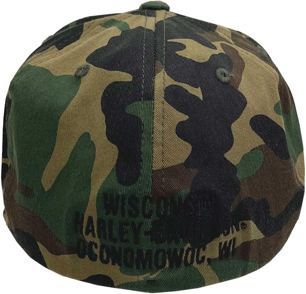 Harley-Davidson Men's Find Me Baseball Cap - Camo, 50290112. Comfortable six panel structured stretch fit curved bill ballcap in an awesome allover Camo pattern. Constructed from durable 97% cotton and 3% spandex. High-quality embroidered outline Bar & Shield logo on front panels. Our Wisconsin Harley dealer name in black stitching on back. Durable and super comfortable hat, perfect for any Harley enthusiast.