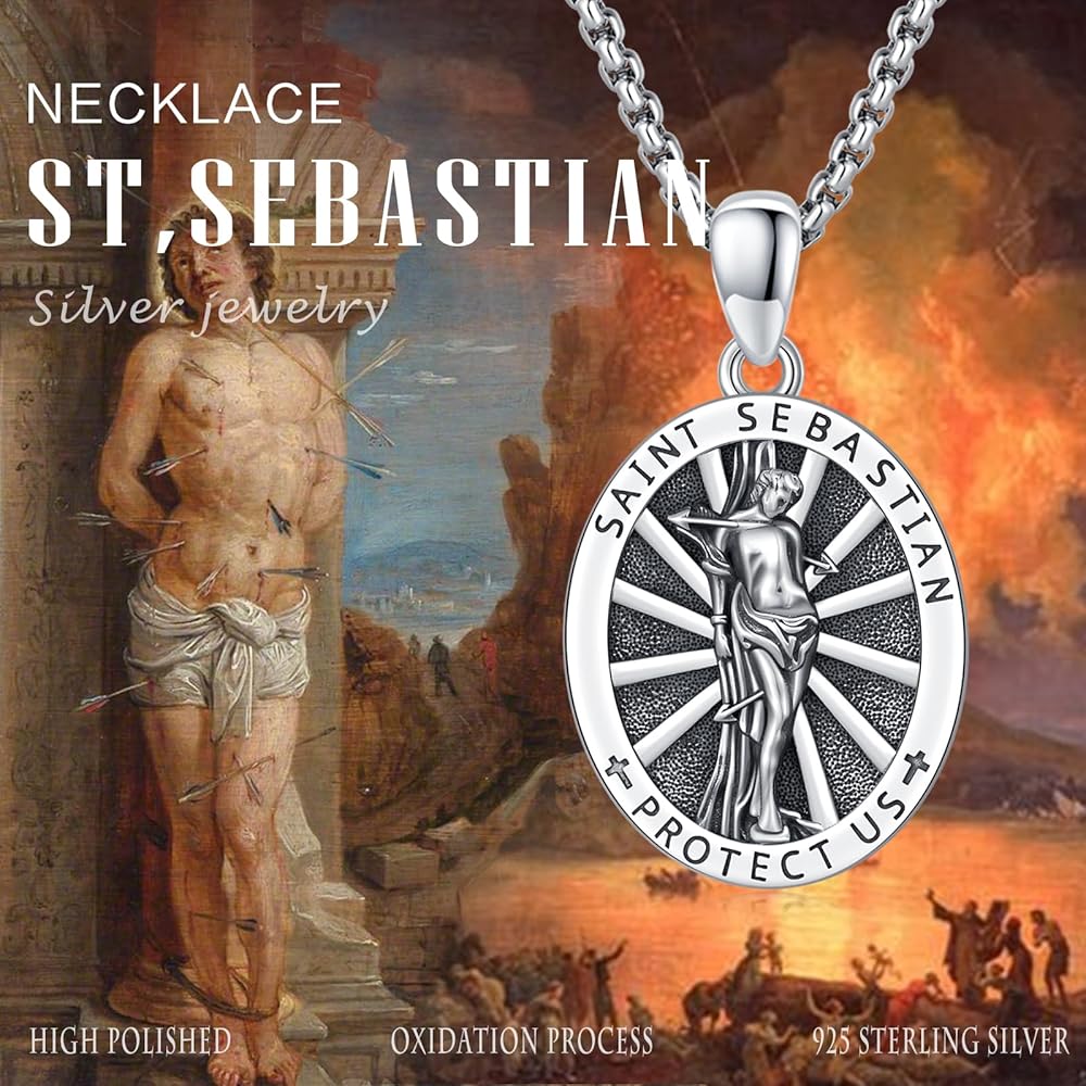 Saint Sebastian Necklace Mens: Saint Sebastian is often depicted in art and iconography as a young and heroic soldier with arrows piercing his body. He is widely revered as a martyr and healer, and is seen as a patron saint against illness and hardship. St Sebastian pendant will bring you blessings