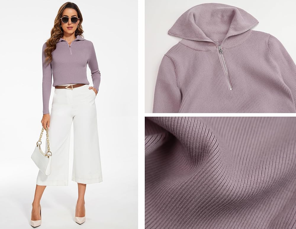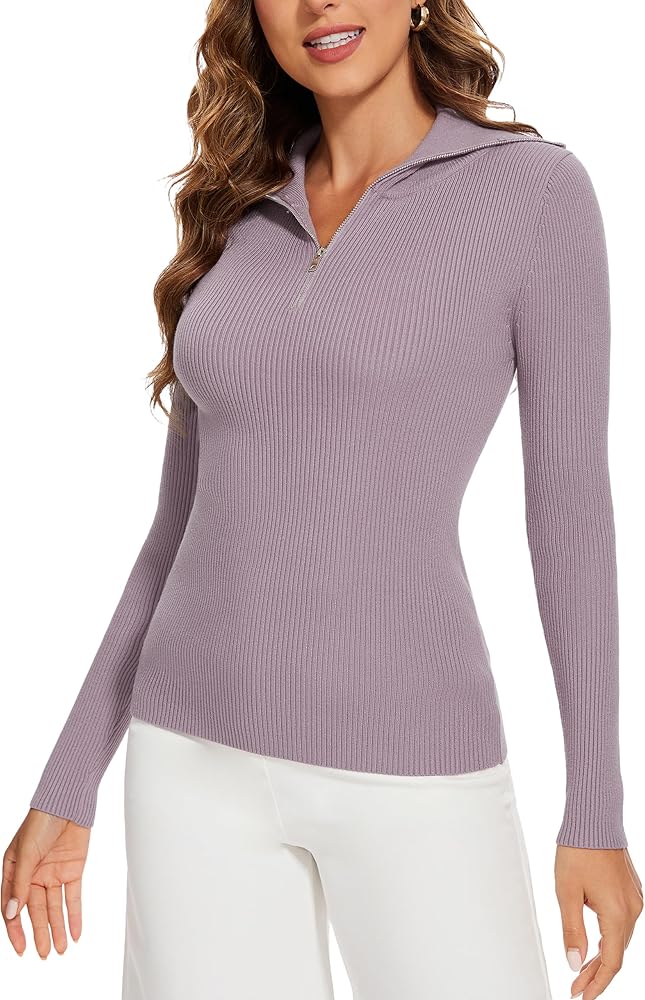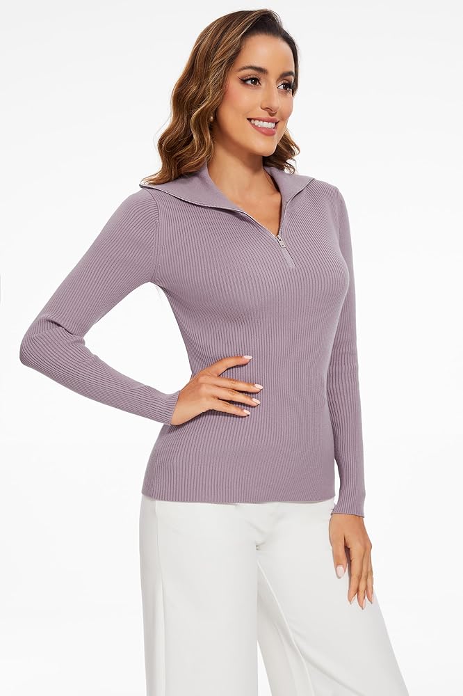 Trendy & Versatile Design: This long-sleeve pullover sweater features a 1/4 zipper with a foldable collar, ribbed hem and cuffs, and a classic solid striped pattern. Made from comfy, stretchy knit fabric, it's a versatile addition to any woman's wardrobe, offering both style and warmth.